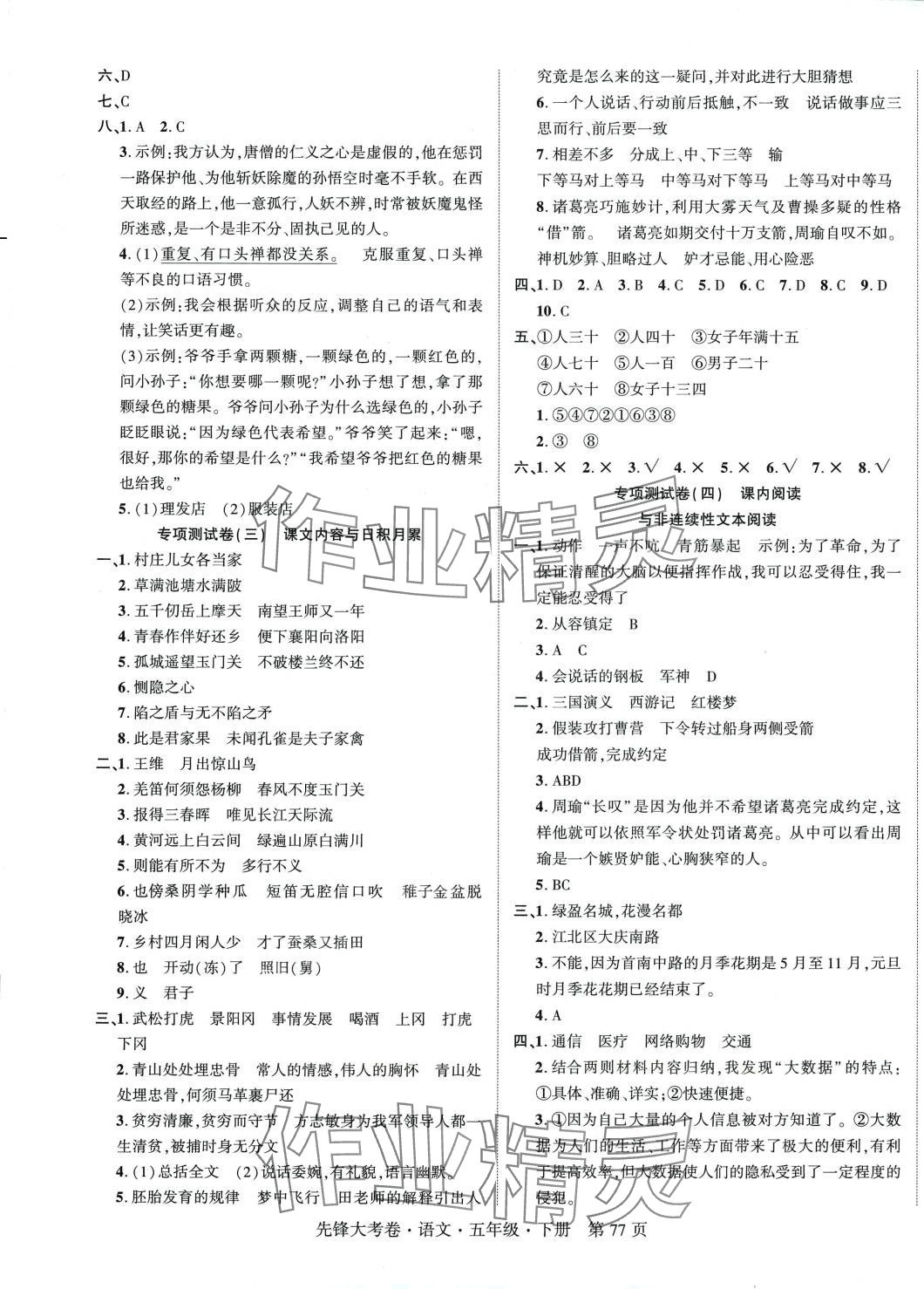 注:目前有些书本章节名称可能整理的还不是很完善,但都是按照顺序排列的,请同学们按照顺序仔细查找。练习册 2024年单元加期末复习先锋大考卷五年级语文下册人教版 答案主要是用来给同学们做完题方便对答案用的,请勿直接抄袭。