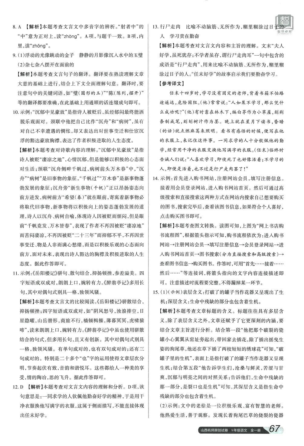 注:目前有些书本章节名称可能整理的还不是很完善,但都是按照顺序排列的,请同学们按照顺序仔细查找。练习册 2024年山西名师原创试卷九年级语文全一册人教版 答案主要是用来给同学们做完题方便对答案用的,请勿直接抄袭。