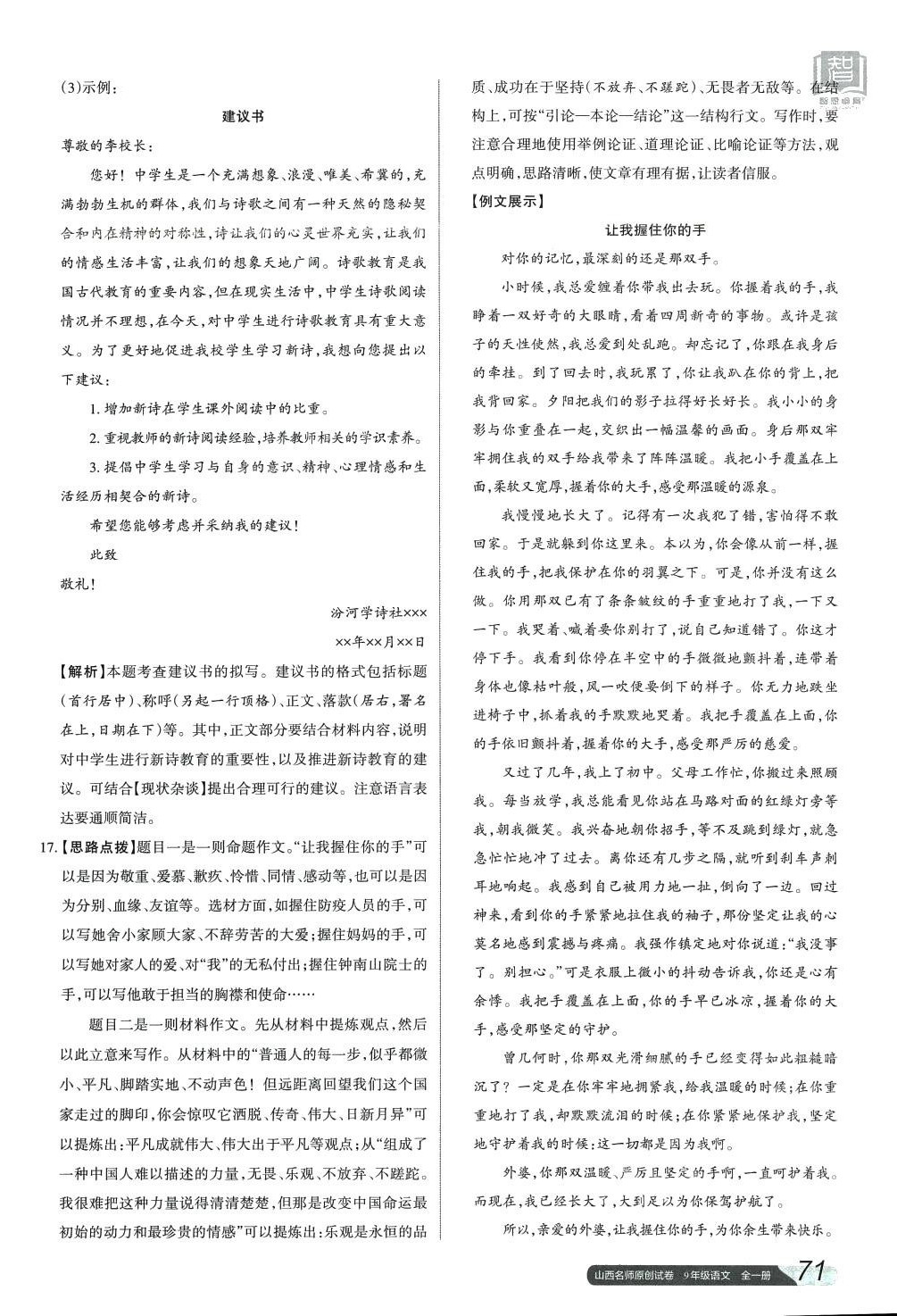 注:目前有些书本章节名称可能整理的还不是很完善,但都是按照顺序排列的,请同学们按照顺序仔细查找。练习册 2024年山西名师原创试卷九年级语文全一册人教版 答案主要是用来给同学们做完题方便对答案用的,请勿直接抄袭。