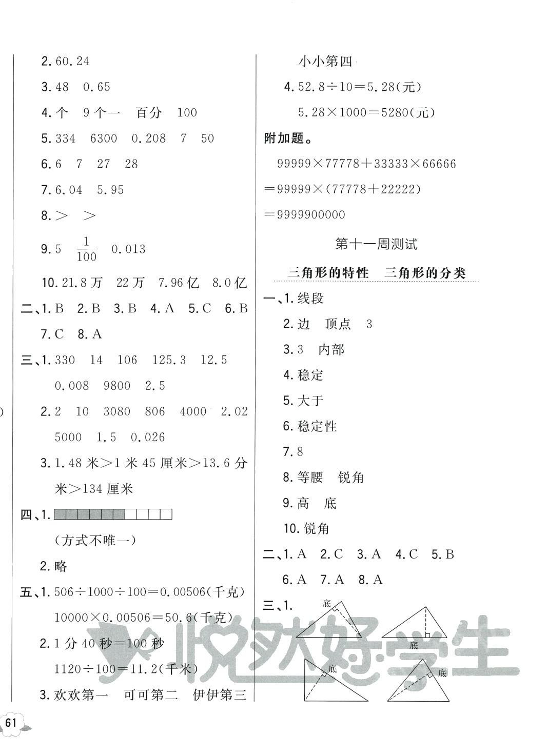 注:目前有些书本章节名称可能整理的还不是很完善,但都是按照顺序排列的,请同学们按照顺序仔细查找。练习册 2024年悦然好学生周周测四年级数学下册人教版 答案主要是用来给同学们做完题方便对答案用的,请勿直接抄袭。