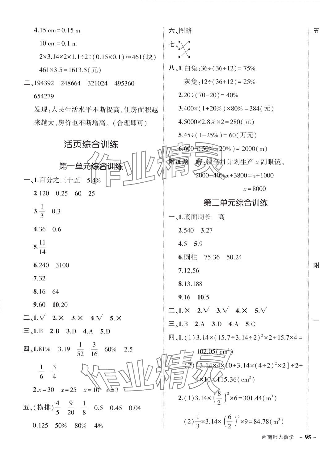 注:目前有些书本章节名称可能整理的还不是很完善,但都是按照顺序排列的,请同学们按照顺序仔细查找。练习册 2024年状元成才路创优作业100分六年级数学下册西师大版 答案主要是用来给同学们做完题方便对答案用的,请勿直接抄袭。