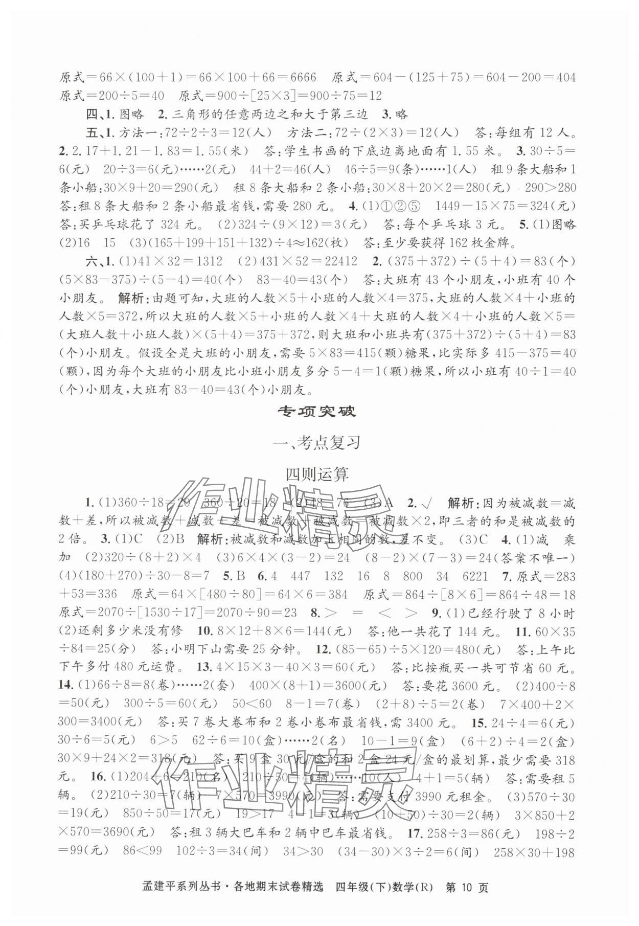 注:目前有些书本章节名称可能整理的还不是很完善,但都是按照顺序排列的,请同学们按照顺序仔细查找。练习册 2024年孟建平各地期末试卷精选四年级数学下册人教版 答案主要是用来给同学们做完题方便对答案用的,请勿直接抄袭。