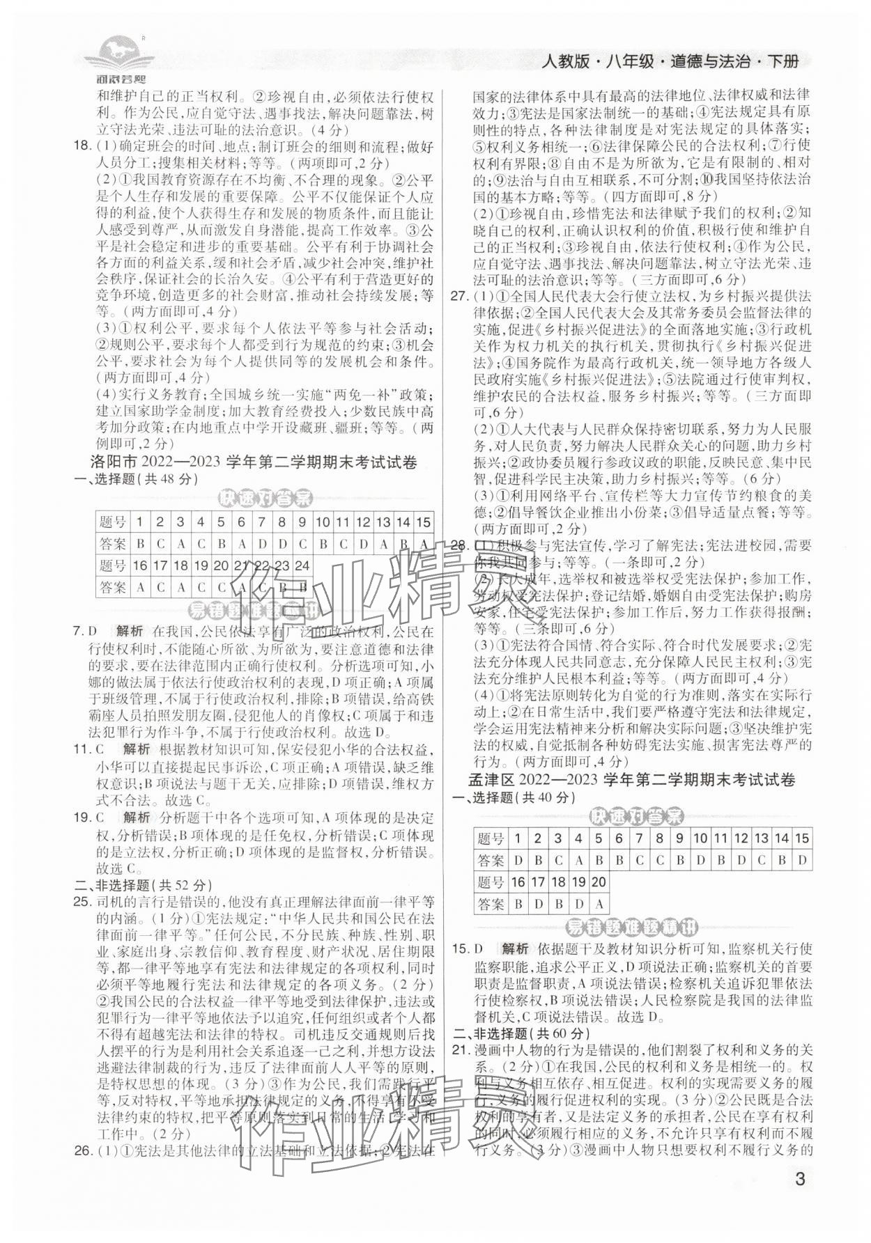 注:目前有些书本章节名称可能整理的还不是很完善,但都是按照顺序排列的,请同学们按照顺序仔细查找。练习册 2024年期末考试必刷卷八年级道德与法治下册人教版洛阳专版 答案主要是用来给同学们做完题方便对答案用的,请勿直接抄袭。