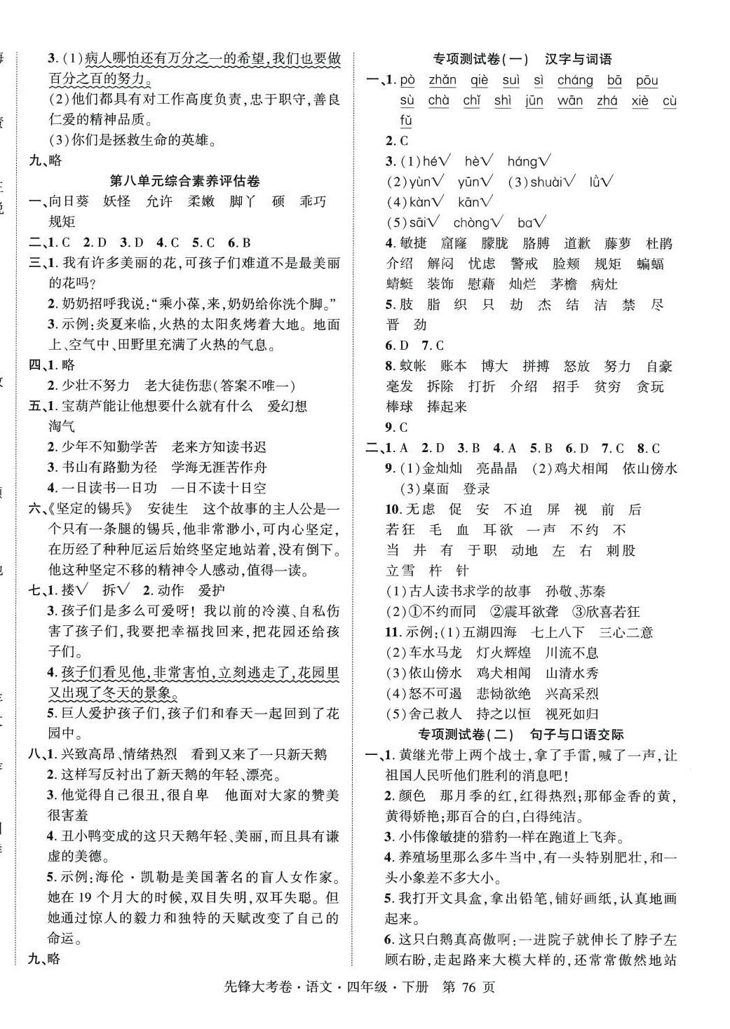 注:目前有些书本章节名称可能整理的还不是很完善,但都是按照顺序排列的,请同学们按照顺序仔细查找。练习册 2024年单元加期末复习先锋大考卷四年级语文下册人教版 答案主要是用来给同学们做完题方便对答案用的,请勿直接抄袭。