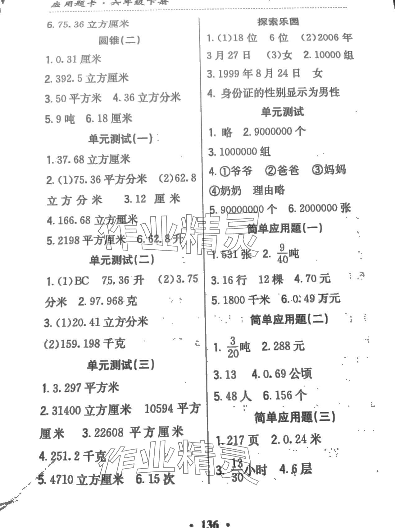 注:目前有些书本章节名称可能整理的还不是很完善,但都是按照顺序排列的,请同学们按照顺序仔细查找。练习册 2024年应用题卡河北美术出版社六年级数学下册人教版2 答案主要是用来给同学们做完题方便对答案用的,请勿直接抄袭。