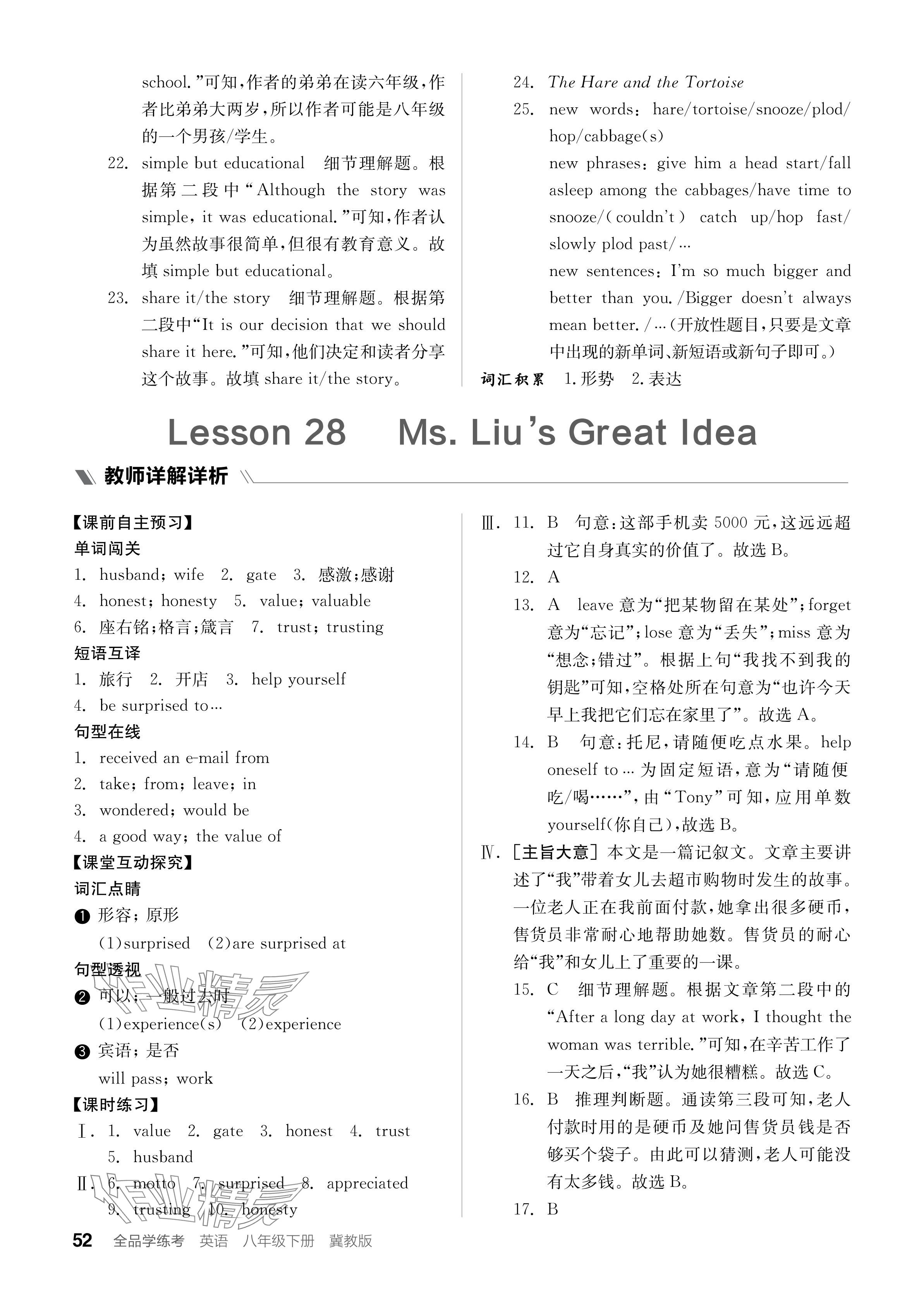 注:目前有些书本章节名称可能整理的还不是很完善,但都是按照顺序排列的,请同学们按照顺序仔细查找。练习册 2024年全品学练考八年级英语下册冀教版 答案主要是用来给同学们做完题方便对答案用的,请勿直接抄袭。