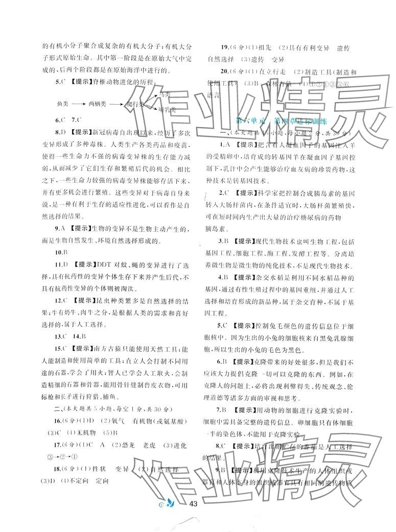 注:目前有些书本章节名称可能整理的还不是很完善,但都是按照顺序排列的,请同学们按照顺序仔细查找。练习册 2024年新课程学习与测评单元双测八年级生物下册冀少版C版 答案主要是用来给同学们做完题方便对答案用的,请勿直接抄袭。