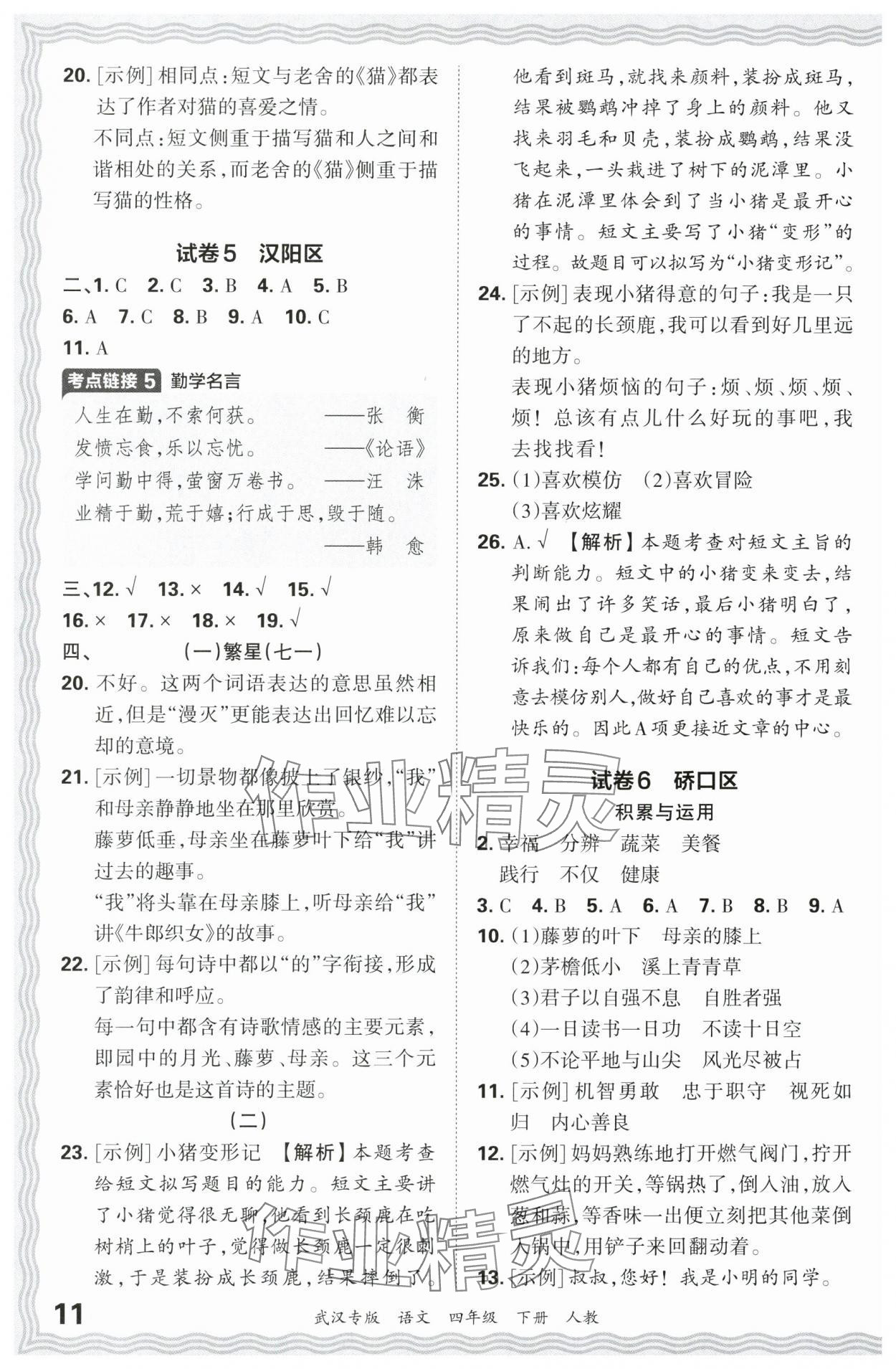 注:目前有些书本章节名称可能整理的还不是很完善,但都是按照顺序排列的,请同学们按照顺序仔细查找。练习册 2024年王朝霞期末真题精编四年级语文下册人教版武汉专版 答案主要是用来给同学们做完题方便对答案用的,请勿直接抄袭。