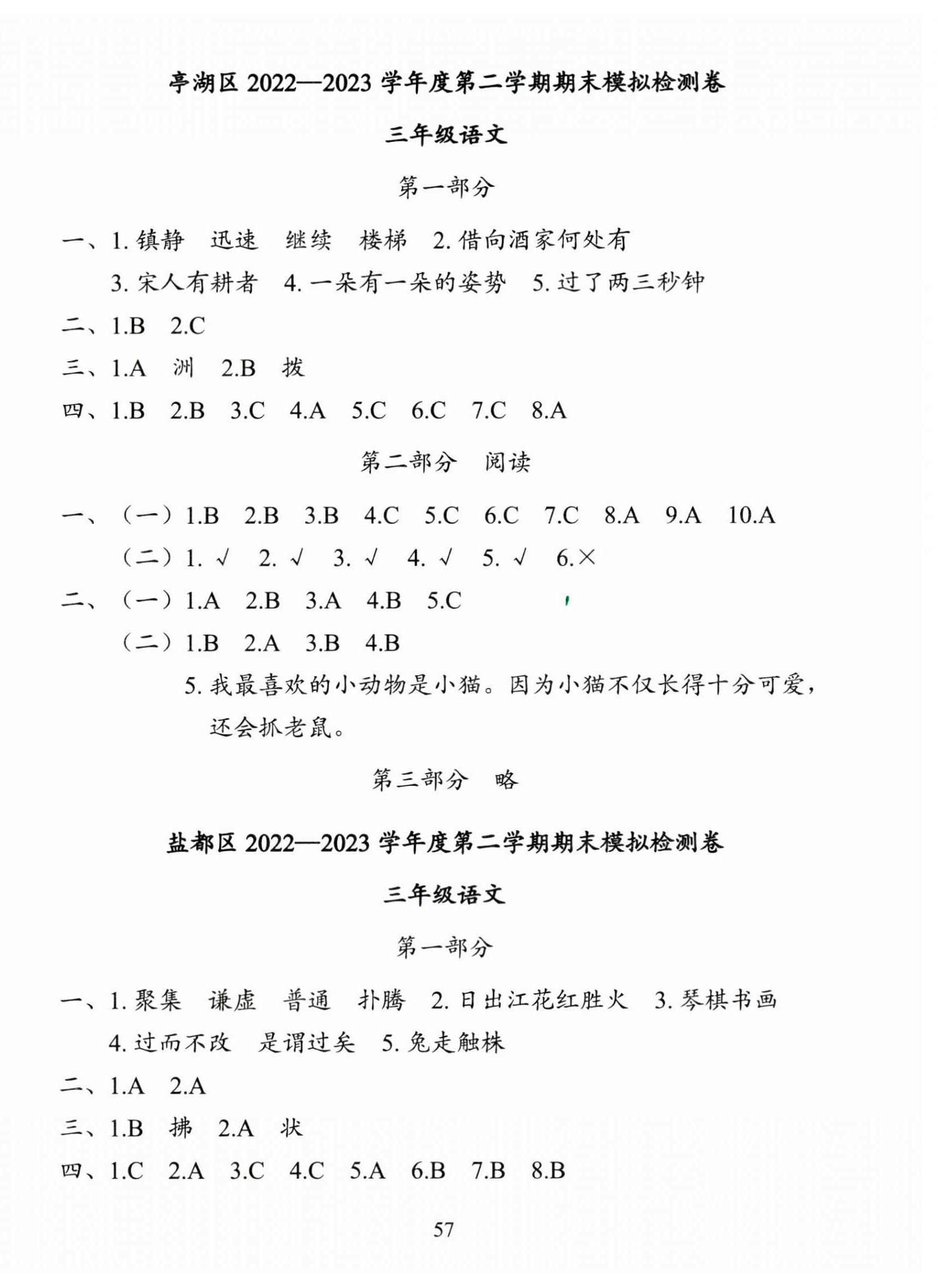 注:目前有些书本章节名称可能整理的还不是很完善,但都是按照顺序排列的,请同学们按照顺序仔细查找。练习册 2024年小学期末试卷汇编三年级语文下册人教版北京出版社 答案主要是用来给同学们做完题方便对答案用的,请勿直接抄袭。