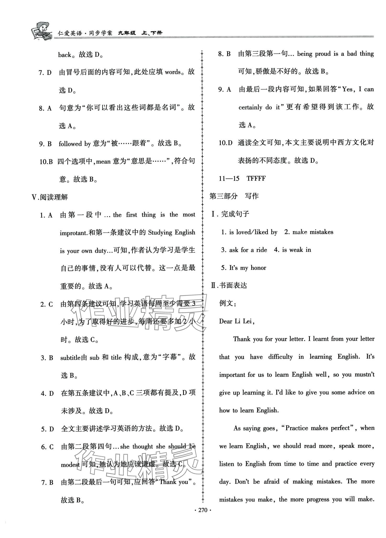 注:目前有些书本章节名称可能整理的还不是很完善,但都是按照顺序排列的,请同学们按照顺序仔细查找。练习册 2024年仁爱英语同步学案九年级全一册仁爱版 答案主要是用来给同学们做完题方便对答案用的,请勿直接抄袭。