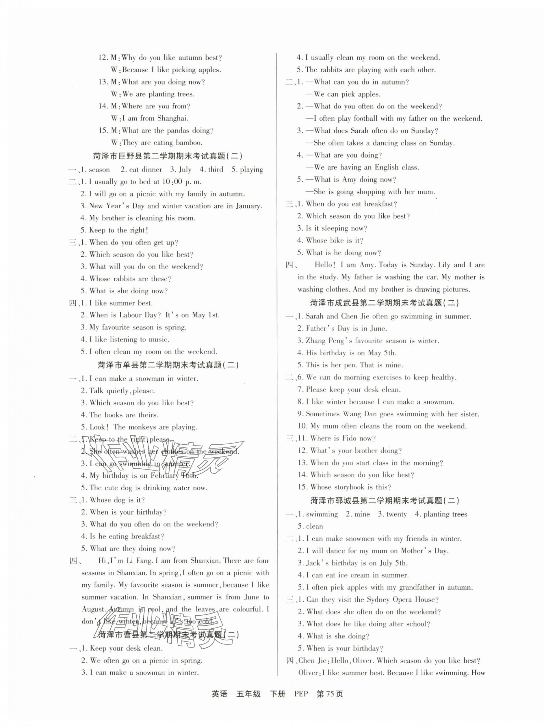 注:目前有些书本章节名称可能整理的还不是很完善,但都是按照顺序排列的,请同学们按照顺序仔细查找。练习册 2024年全优考评一卷通菏泽真题汇编五年级英语下册人教版菏泽专版 答案主要是用来给同学们做完题方便对答案用的,请勿直接抄袭。