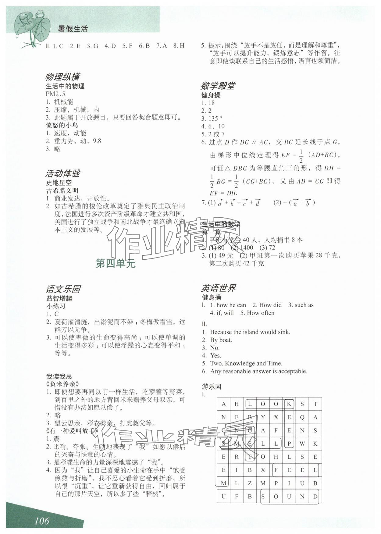 注:目前有些书本章节名称可能整理的还不是很完善,但都是按照顺序排列的,请同学们按照顺序仔细查找。练习册 2024年暑假生活上海教育出版社八年级数学 答案主要是用来给同学们做完题方便对答案用的,请勿直接抄袭。
