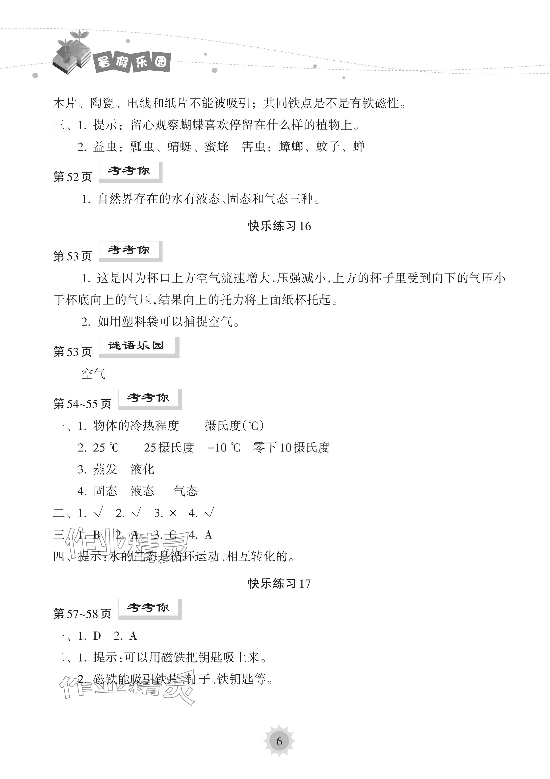 注:目前有些书本章节名称可能整理的还不是很完善,但都是按照顺序排列的,请同学们按照顺序仔细查找。练习册 2024年暑假乐园海南出版社三年级科学教科版 答案主要是用来给同学们做完题方便对答案用的,请勿直接抄袭。