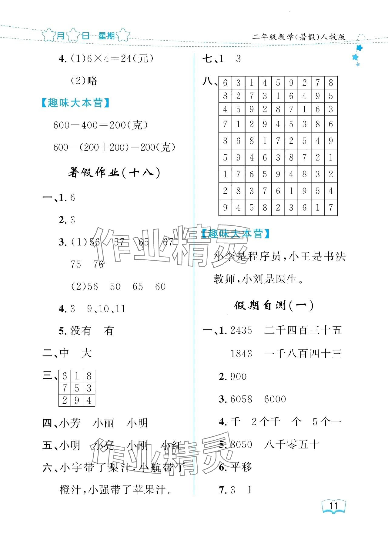 注:目前有些书本章节名称可能整理的还不是很完善,但都是按照顺序排列的,请同学们按照顺序仔细查找。练习册 2024年阳光假日暑假二年级数学人教版 答案主要是用来给同学们做完题方便对答案用的,请勿直接抄袭。