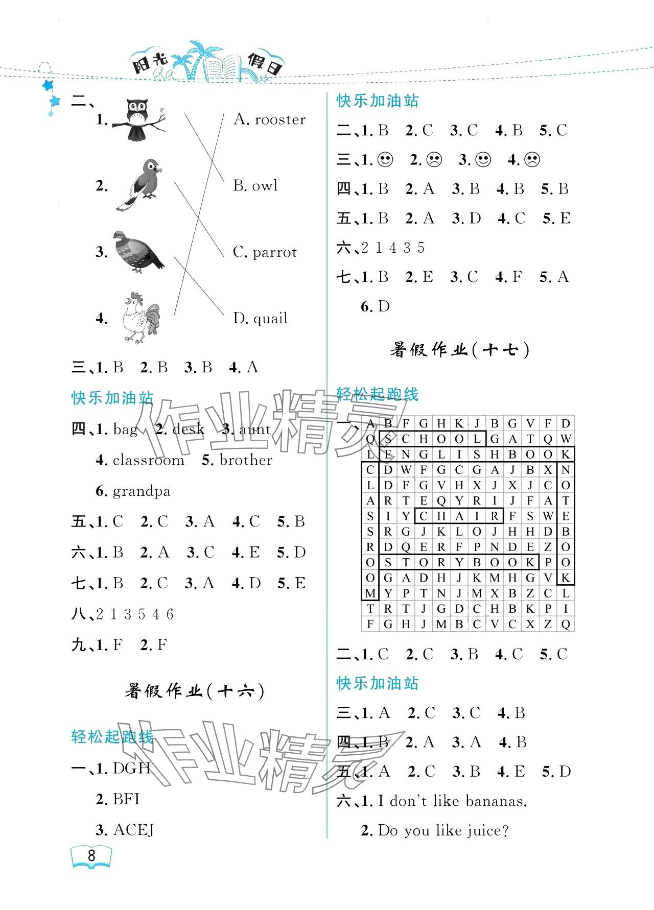 注:目前有些书本章节名称可能整理的还不是很完善,但都是按照顺序排列的,请同学们按照顺序仔细查找。练习册 2024年阳光假日暑假三年级英语人教精通版 答案主要是用来给同学们做完题方便对答案用的,请勿直接抄袭。
