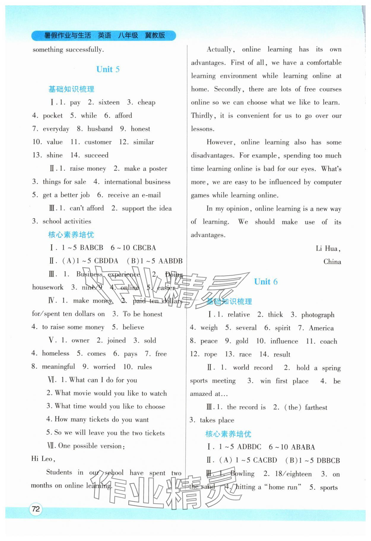 注:目前有些书本章节名称可能整理的还不是很完善,但都是按照顺序排列的,请同学们按照顺序仔细查找。练习册 2024年暑假作业与生活陕西师范大学出版总社有限公司八年级英语冀教版 答案主要是用来给同学们做完题方便对答案用的,请勿直接抄袭。