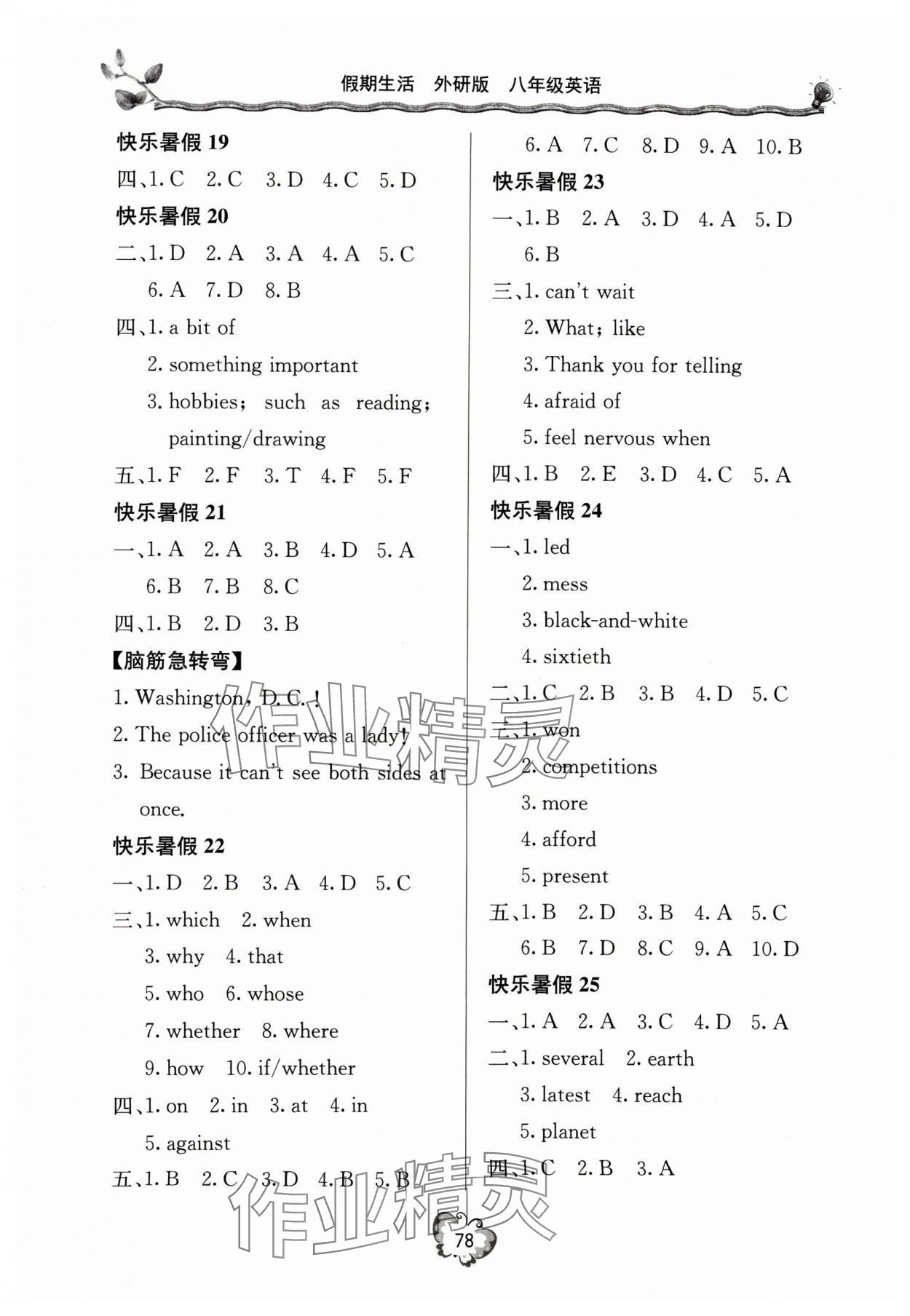 注:目前有些书本章节名称可能整理的还不是很完善,但都是按照顺序排列的,请同学们按照顺序仔细查找。练习册 2024年新课堂假期生活暑假用书八年级英语外研版 答案主要是用来给同学们做完题方便对答案用的,请勿直接抄袭。