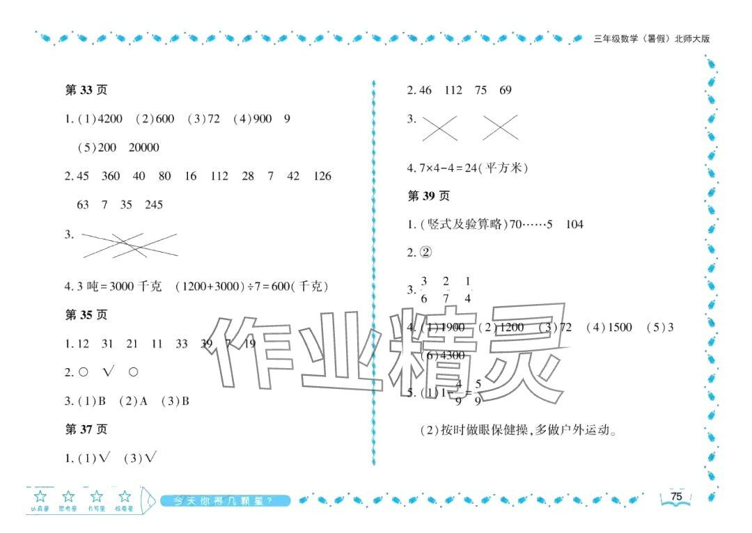 注:目前有些书本章节名称可能整理的还不是很完善,但都是按照顺序排列的,请同学们按照顺序仔细查找。练习册 2024年阳光假日暑假三年级数学北师大版 答案主要是用来给同学们做完题方便对答案用的,请勿直接抄袭。