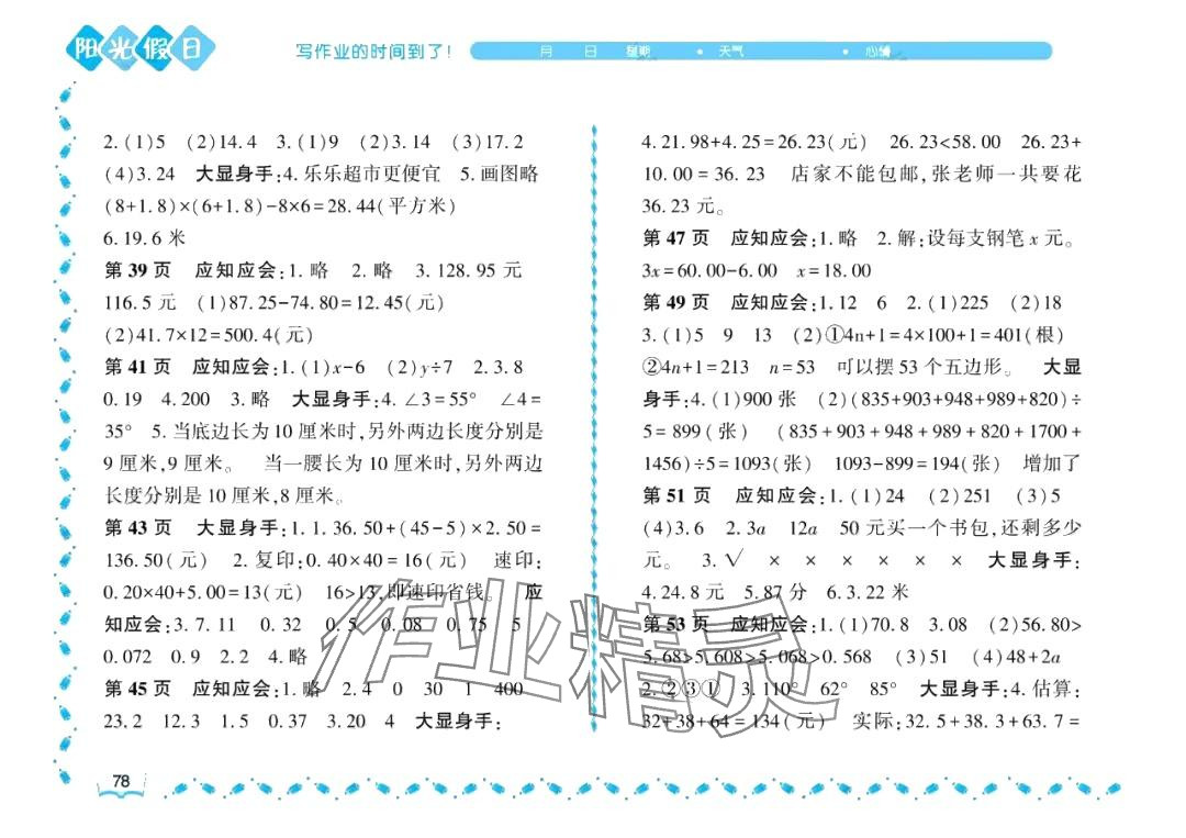 注:目前有些书本章节名称可能整理的还不是很完善,但都是按照顺序排列的,请同学们按照顺序仔细查找。练习册 2024年阳光假日暑假四年级数学北师大版 答案主要是用来给同学们做完题方便对答案用的,请勿直接抄袭。