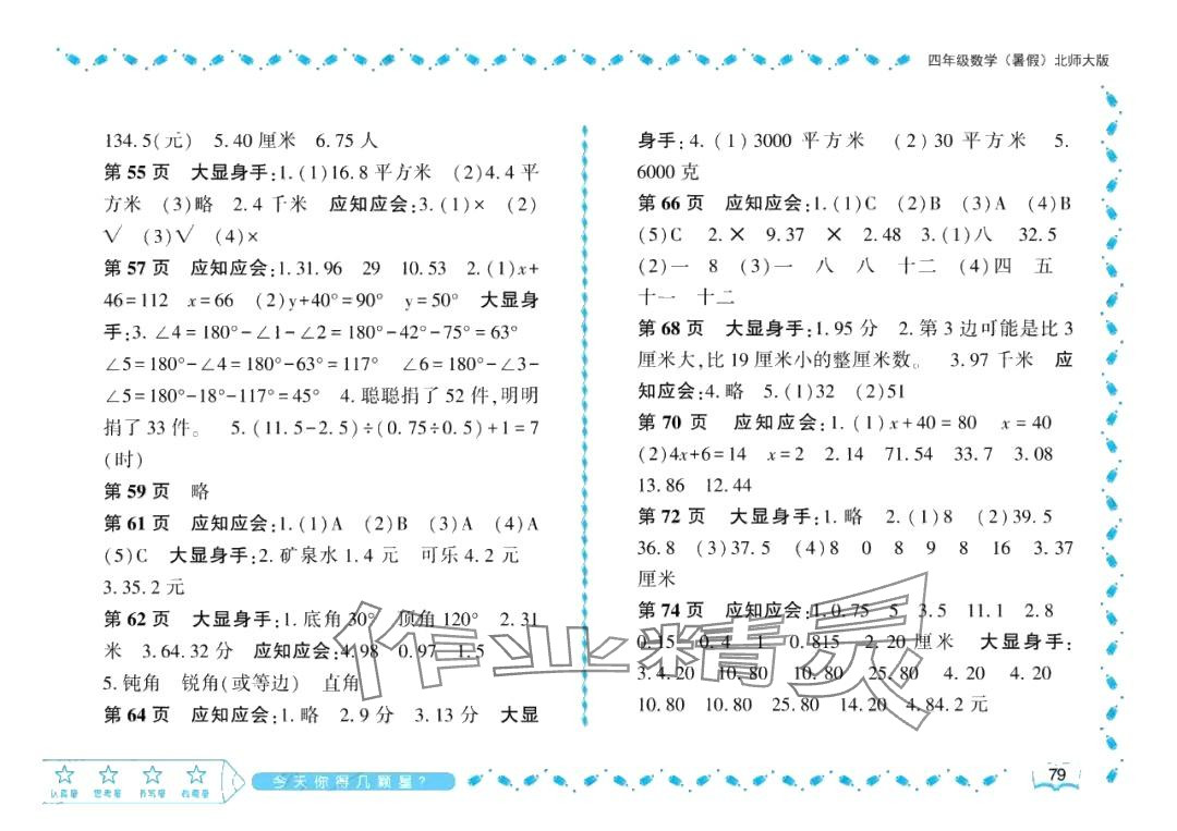 注:目前有些书本章节名称可能整理的还不是很完善,但都是按照顺序排列的,请同学们按照顺序仔细查找。练习册 2024年阳光假日暑假四年级数学北师大版 答案主要是用来给同学们做完题方便对答案用的,请勿直接抄袭。