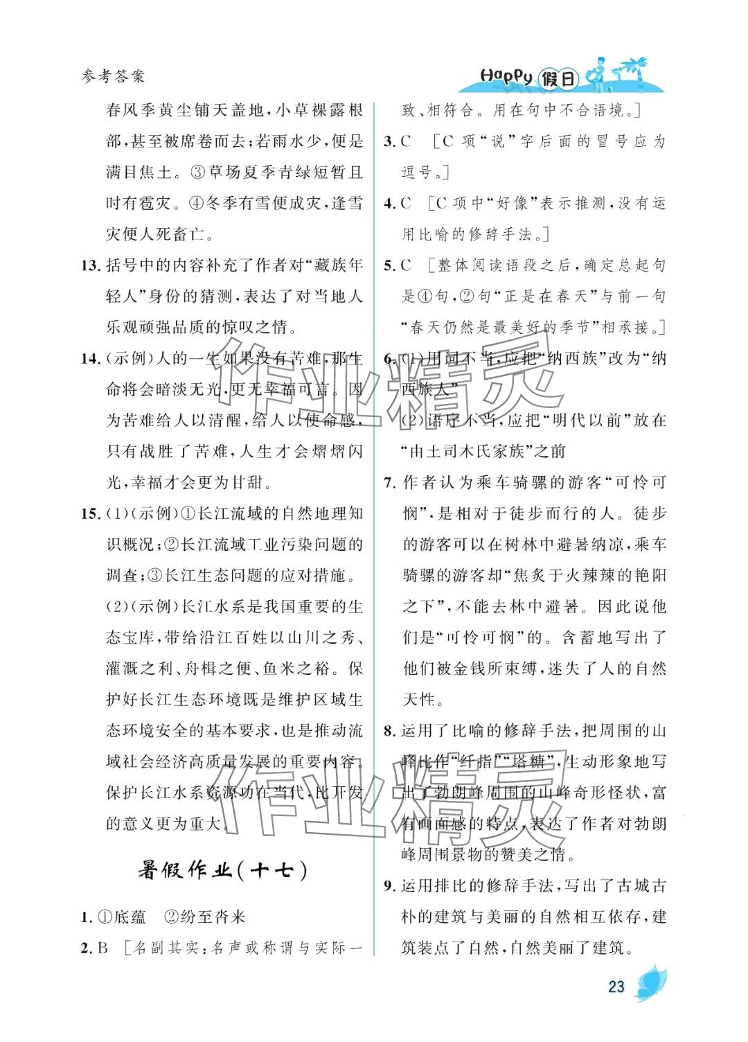 注:目前有些书本章节名称可能整理的还不是很完善,但都是按照顺序排列的,请同学们按照顺序仔细查找。练习册 2024年暑假Happy假日八年级语文人教版 答案主要是用来给同学们做完题方便对答案用的,请勿直接抄袭。