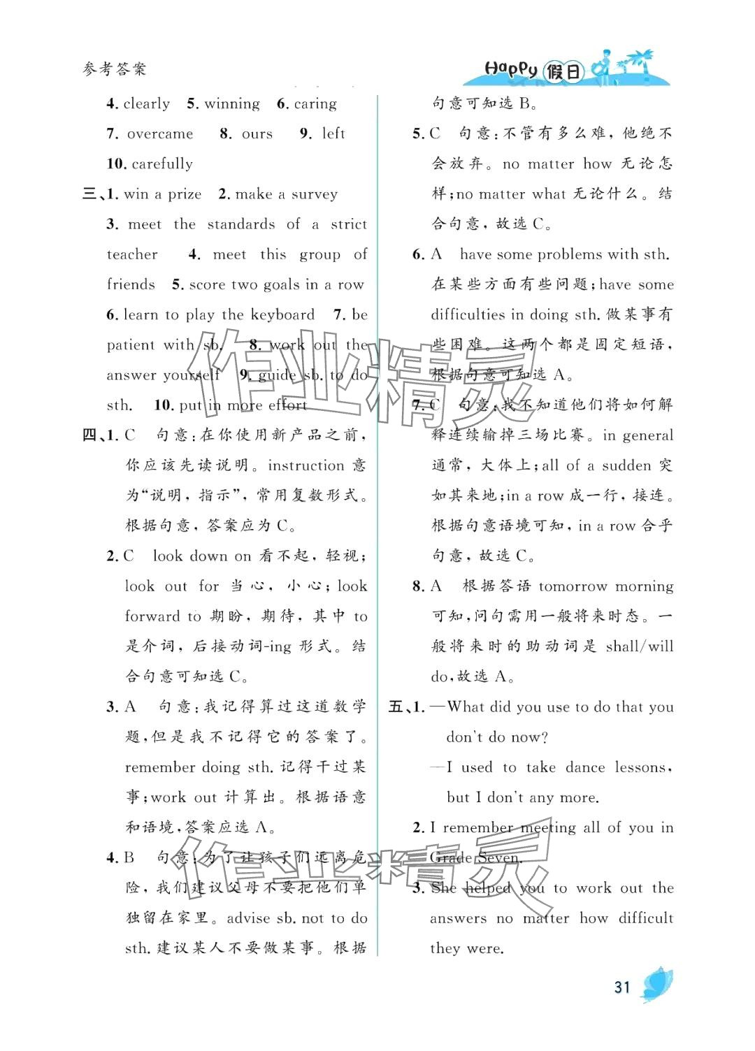 注:目前有些书本章节名称可能整理的还不是很完善,但都是按照顺序排列的,请同学们按照顺序仔细查找。练习册 2024年暑假Happy假日九年级英语人教版 答案主要是用来给同学们做完题方便对答案用的,请勿直接抄袭。