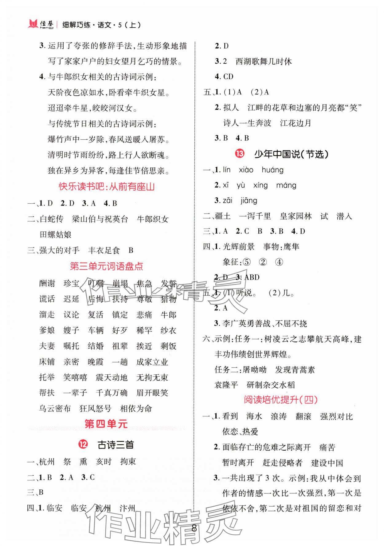 注:目前有些书本章节名称可能整理的还不是很完善,但都是按照顺序排列的,请同学们按照顺序仔细查找。练习册 2024年细解巧练五年级语文上册人教版 答案主要是用来给同学们做完题方便对答案用的,请勿直接抄袭。