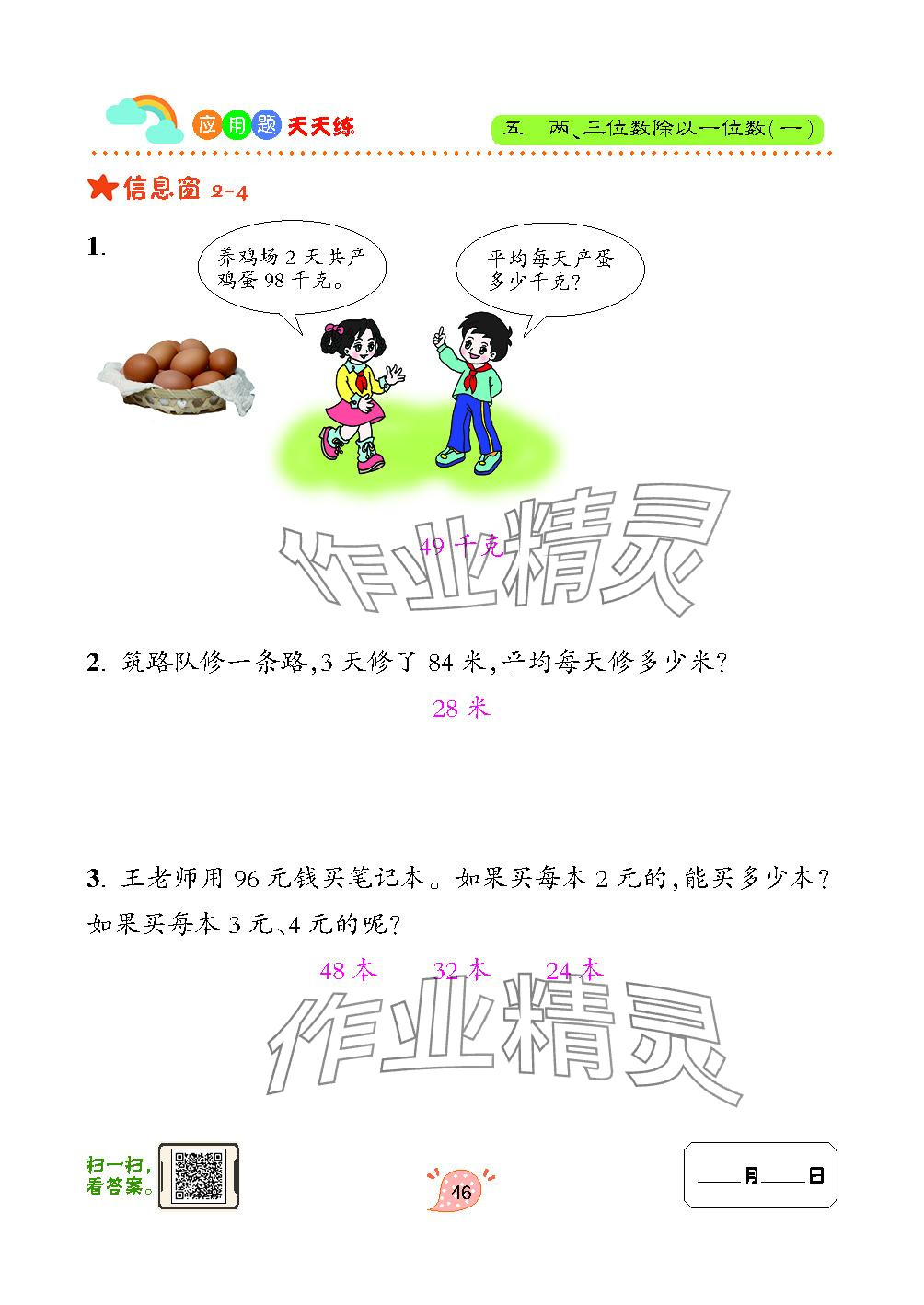 注:目前有些书本章节名称可能整理的还不是很完善,但都是按照顺序排列的,请同学们按照顺序仔细查找。练习册 2024年应用题天天练青岛出版社三年级数学上册青岛版 答案主要是用来给同学们做完题方便对答案用的,请勿直接抄袭。