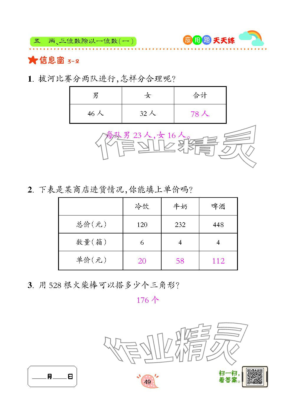 注:目前有些书本章节名称可能整理的还不是很完善,但都是按照顺序排列的,请同学们按照顺序仔细查找。练习册 2024年应用题天天练青岛出版社三年级数学上册青岛版 答案主要是用来给同学们做完题方便对答案用的,请勿直接抄袭。