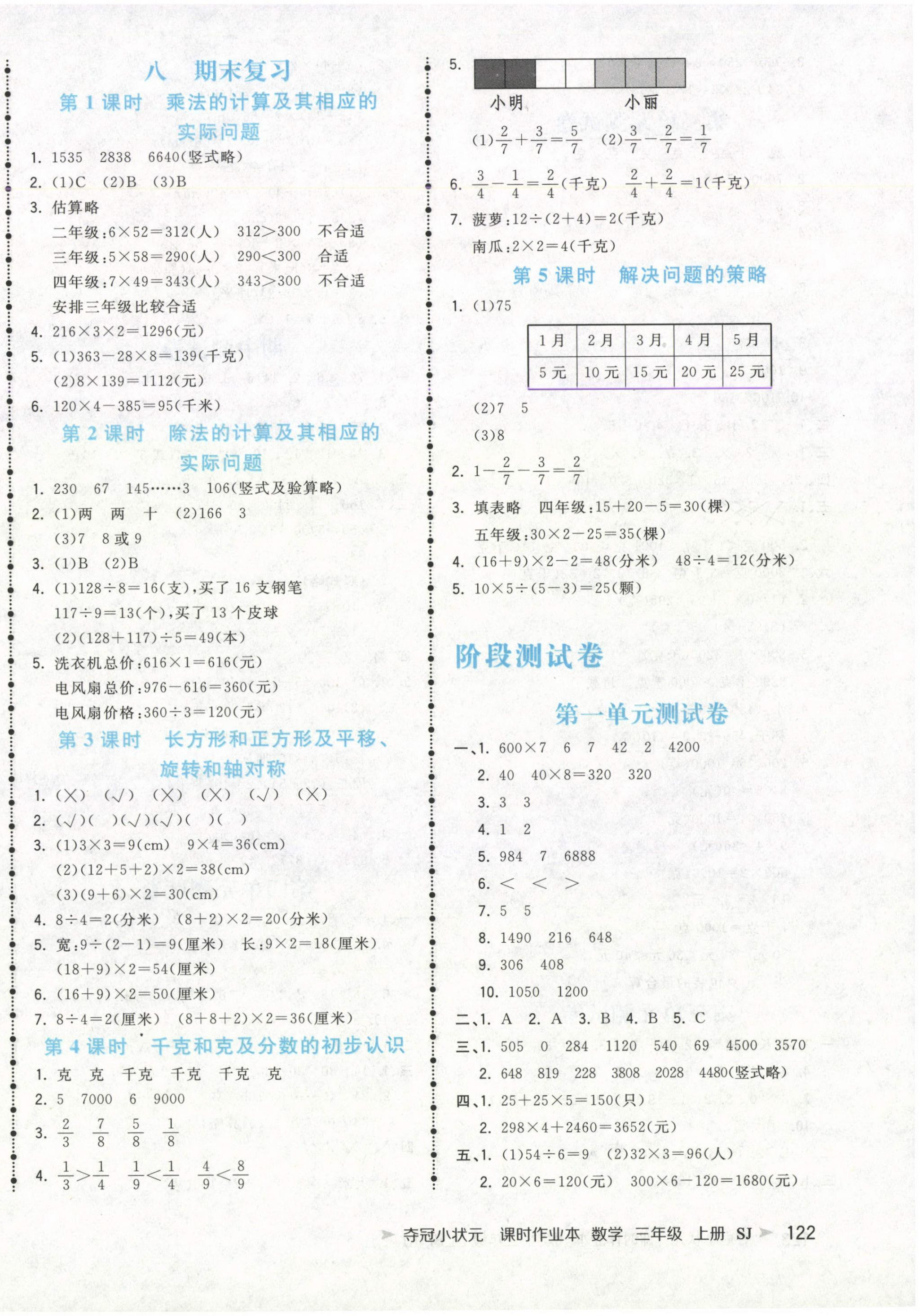 注:目前有些书本章节名称可能整理的还不是很完善,但都是按照顺序排列的,请同学们按照顺序仔细查找。练习册 2024年夺冠小状元课时作业本三年级数学上册苏教版 答案主要是用来给同学们做完题方便对答案用的,请勿直接抄袭。