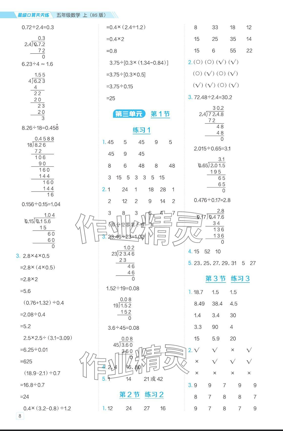 注:目前有些书本章节名称可能整理的还不是很完善,但都是按照顺序排列的,请同学们按照顺序仔细查找。练习册 2024年星级口算天天练五年级数学上册北师大版 答案主要是用来给同学们做完题方便对答案用的,请勿直接抄袭。