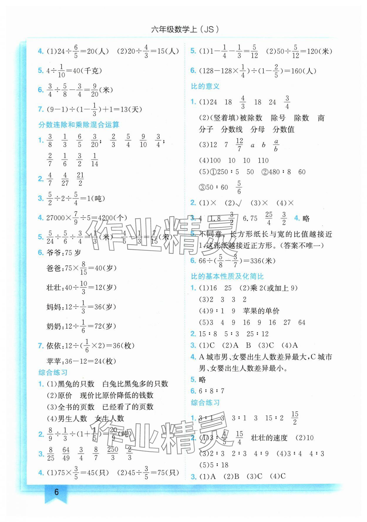 注:目前有些书本章节名称可能整理的还不是很完善,但都是按照顺序排列的,请同学们按照顺序仔细查找。练习册 2024年黄冈小状元作业本六年级数学上册江苏版 答案主要是用来给同学们做完题方便对答案用的,请勿直接抄袭。