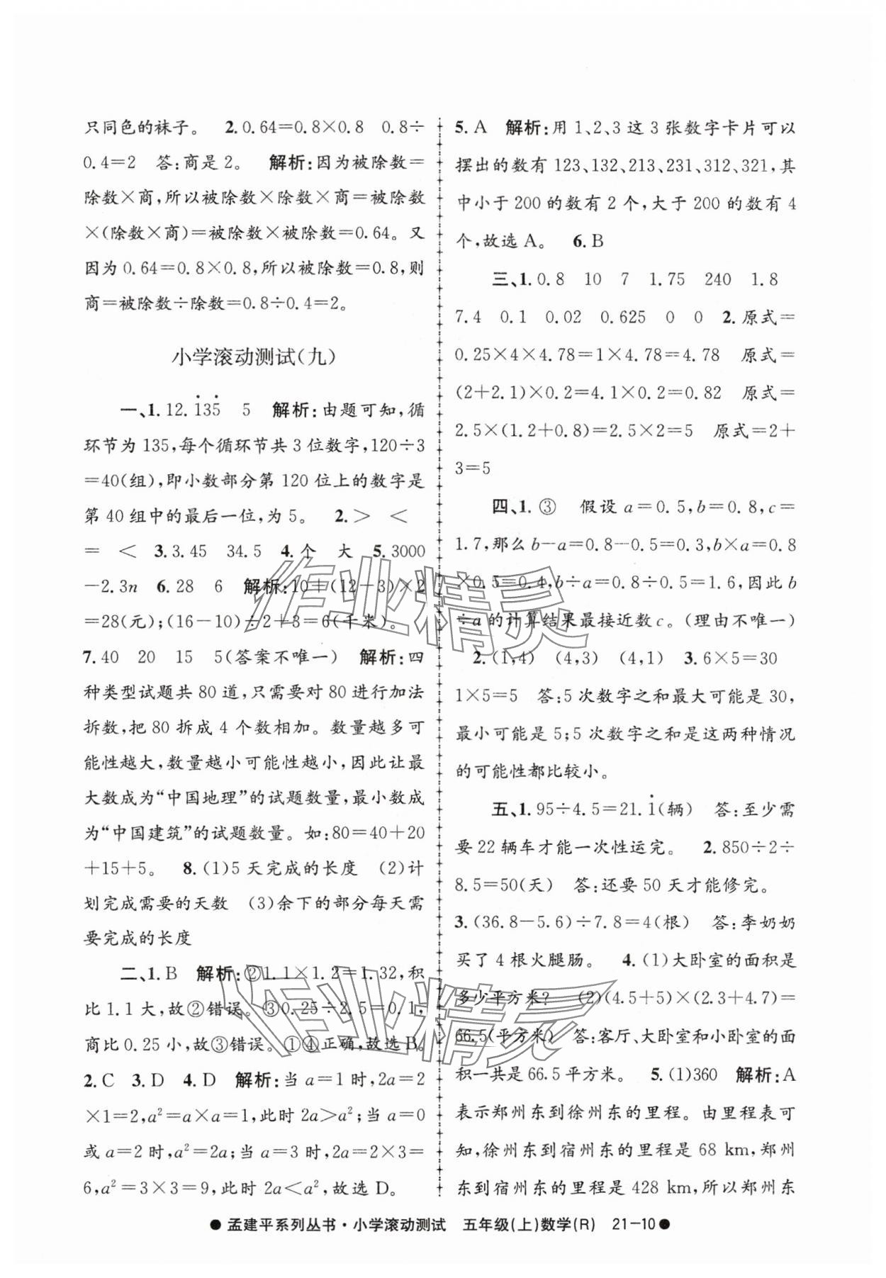 注:目前有些书本章节名称可能整理的还不是很完善,但都是按照顺序排列的,请同学们按照顺序仔细查找。练习册 2024年孟建平小学滚动测试五年级数学上册人教版 答案主要是用来给同学们做完题方便对答案用的,请勿直接抄袭。