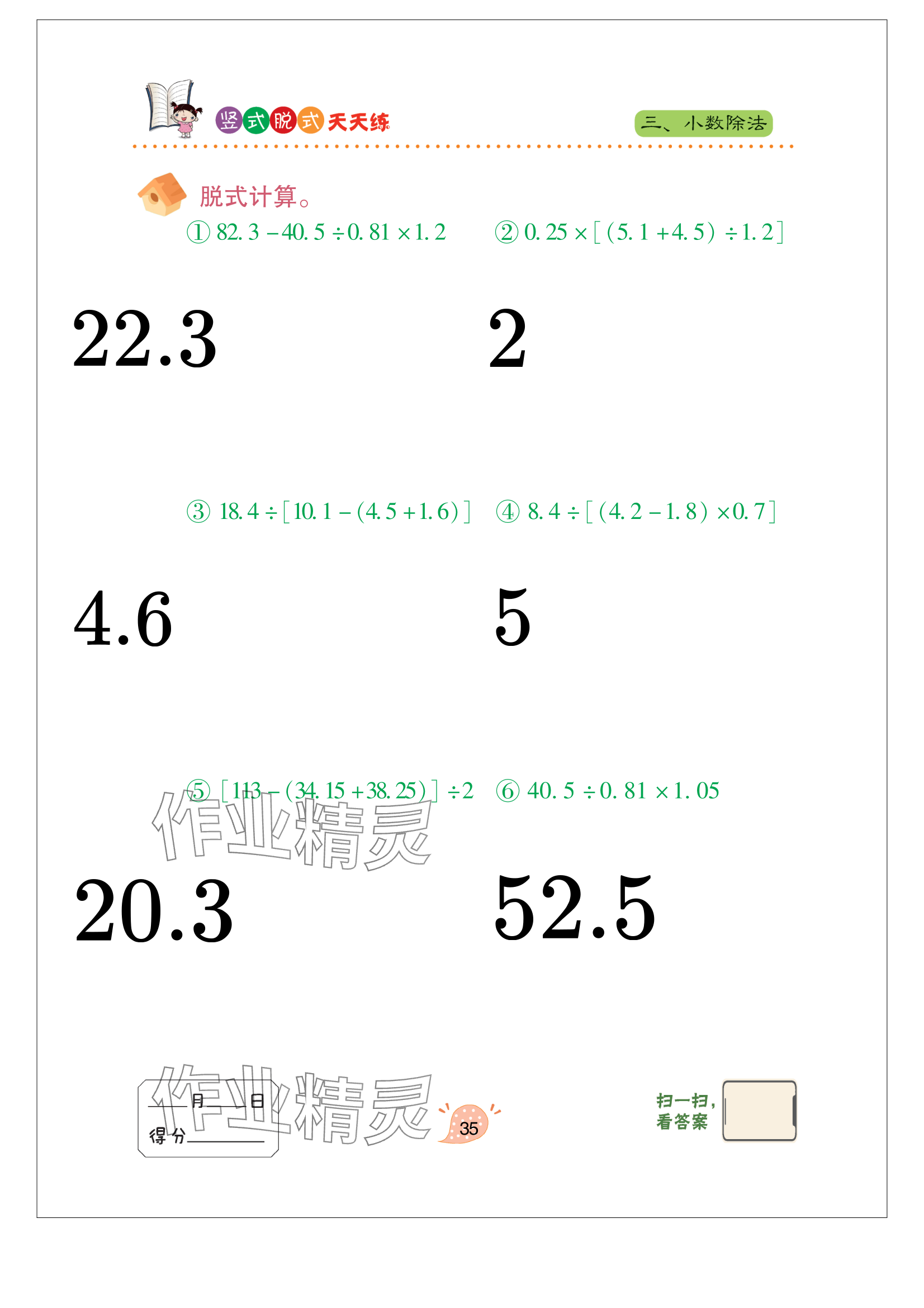 注:目前有些书本章节名称可能整理的还不是很完善,但都是按照顺序排列的,请同学们按照顺序仔细查找。练习册 2024年竖式脱式天天练五年级上册青岛版 答案主要是用来给同学们做完题方便对答案用的,请勿直接抄袭。