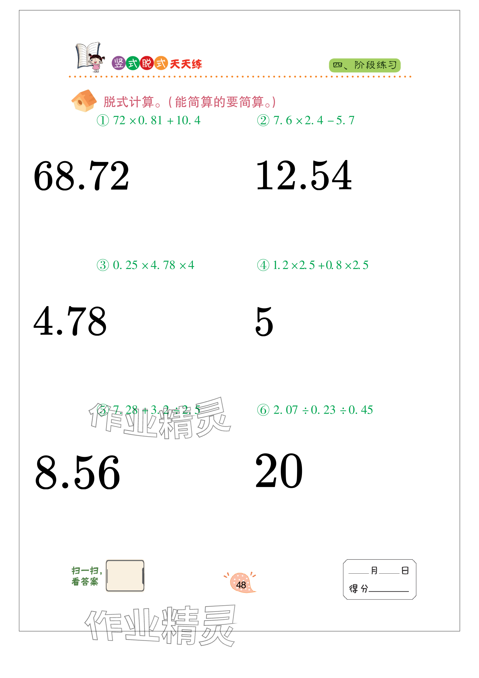 注:目前有些书本章节名称可能整理的还不是很完善,但都是按照顺序排列的,请同学们按照顺序仔细查找。练习册 2024年竖式脱式天天练五年级上册青岛版 答案主要是用来给同学们做完题方便对答案用的,请勿直接抄袭。