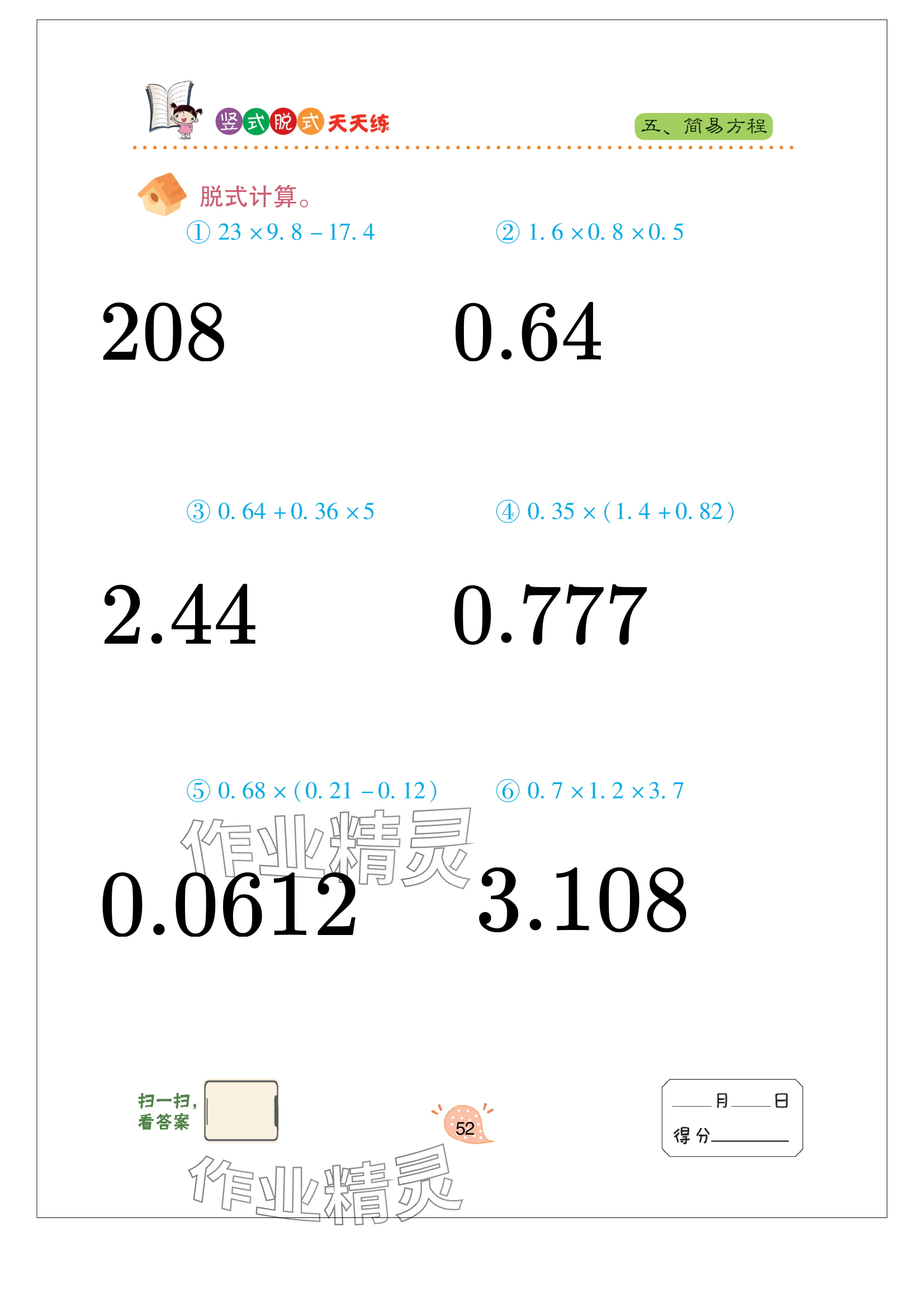 注:目前有些书本章节名称可能整理的还不是很完善,但都是按照顺序排列的,请同学们按照顺序仔细查找。练习册 2024年竖式脱式天天练五年级上册青岛版 答案主要是用来给同学们做完题方便对答案用的,请勿直接抄袭。