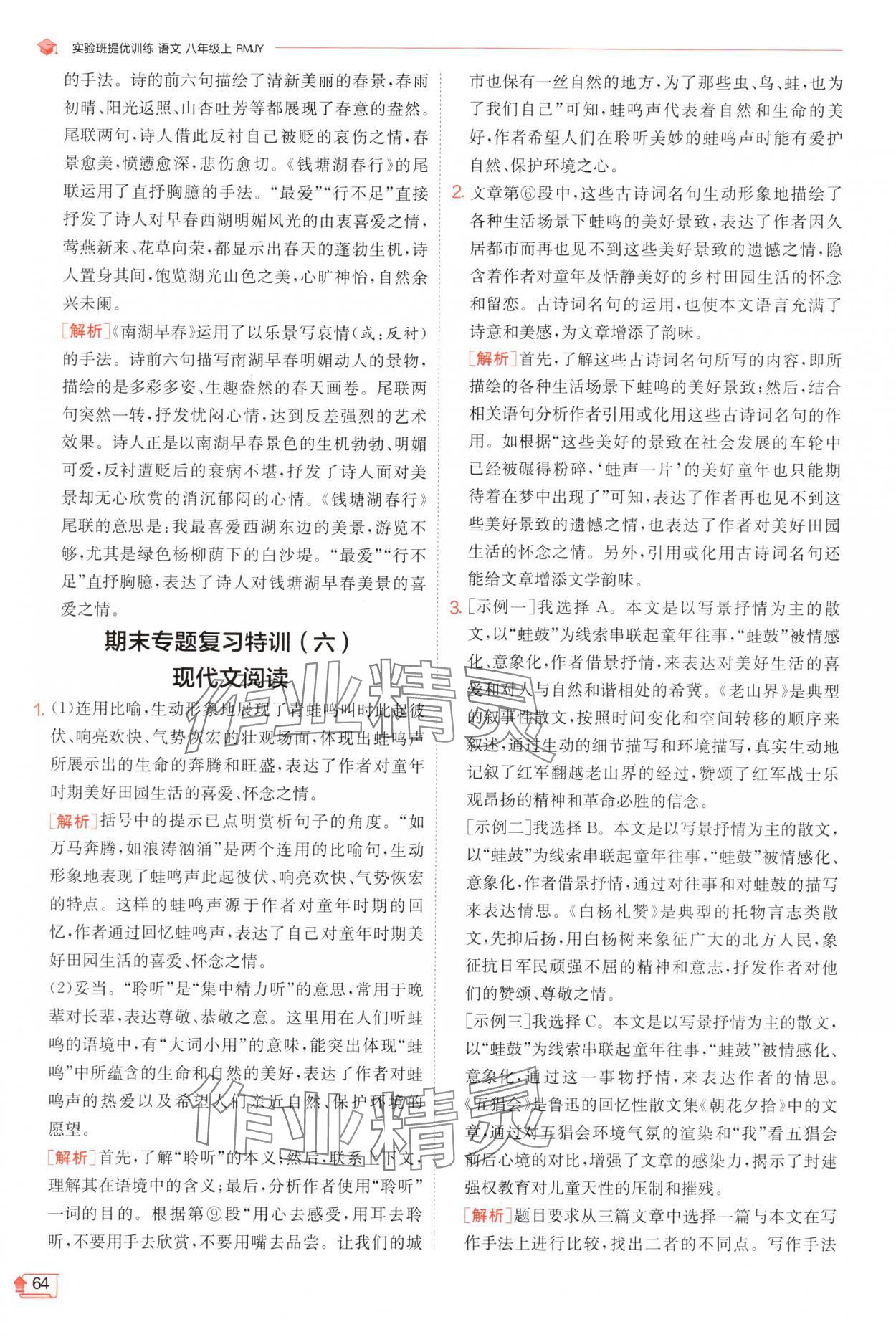 注:目前有些书本章节名称可能整理的还不是很完善,但都是按照顺序排列的,请同学们按照顺序仔细查找。练习册 2024年实验班提优训练八年级语文上册人教版 答案主要是用来给同学们做完题方便对答案用的,请勿直接抄袭。