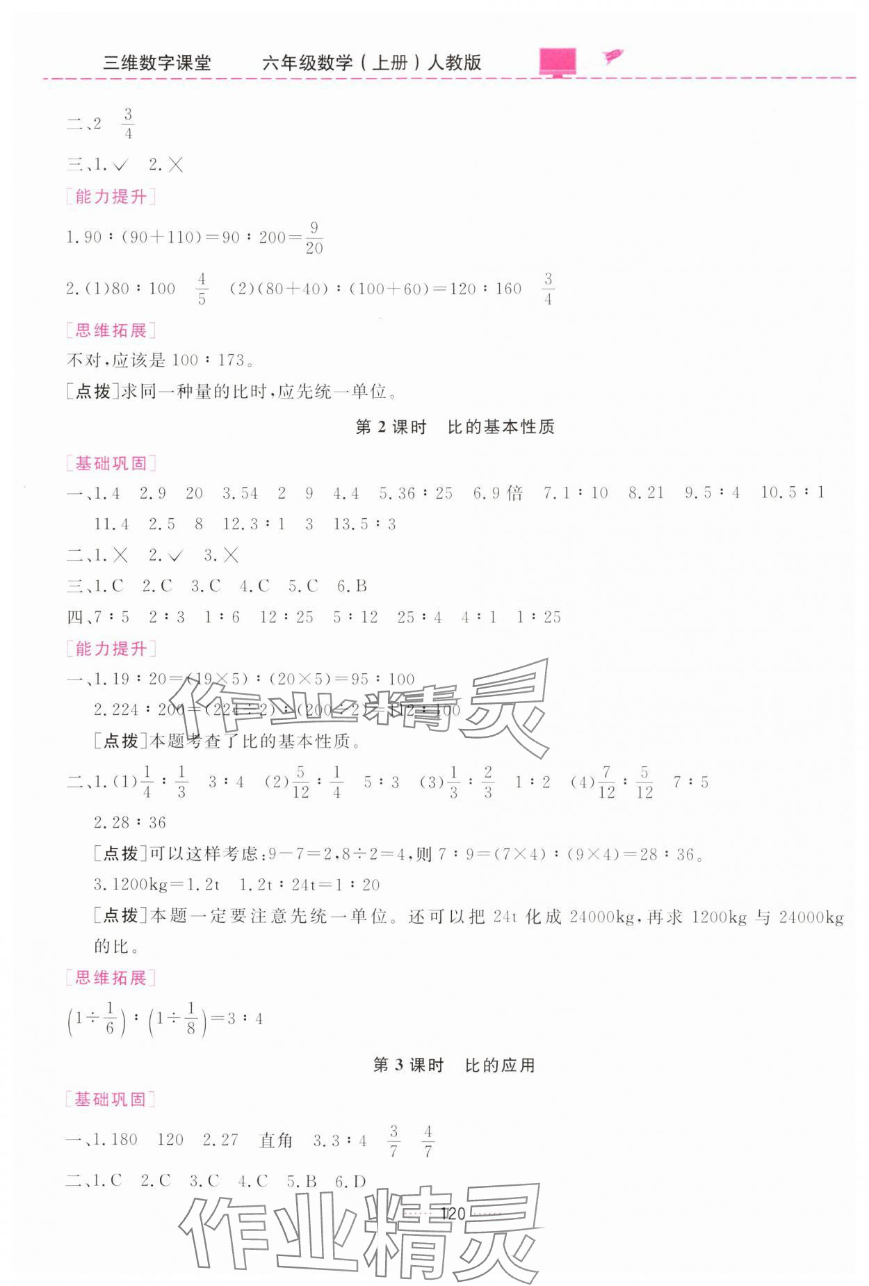 注:目前有些书本章节名称可能整理的还不是很完善,但都是按照顺序排列的,请同学们按照顺序仔细查找。练习册 2024年三维数字课堂六年级数学上册人教版 答案主要是用来给同学们做完题方便对答案用的,请勿直接抄袭。