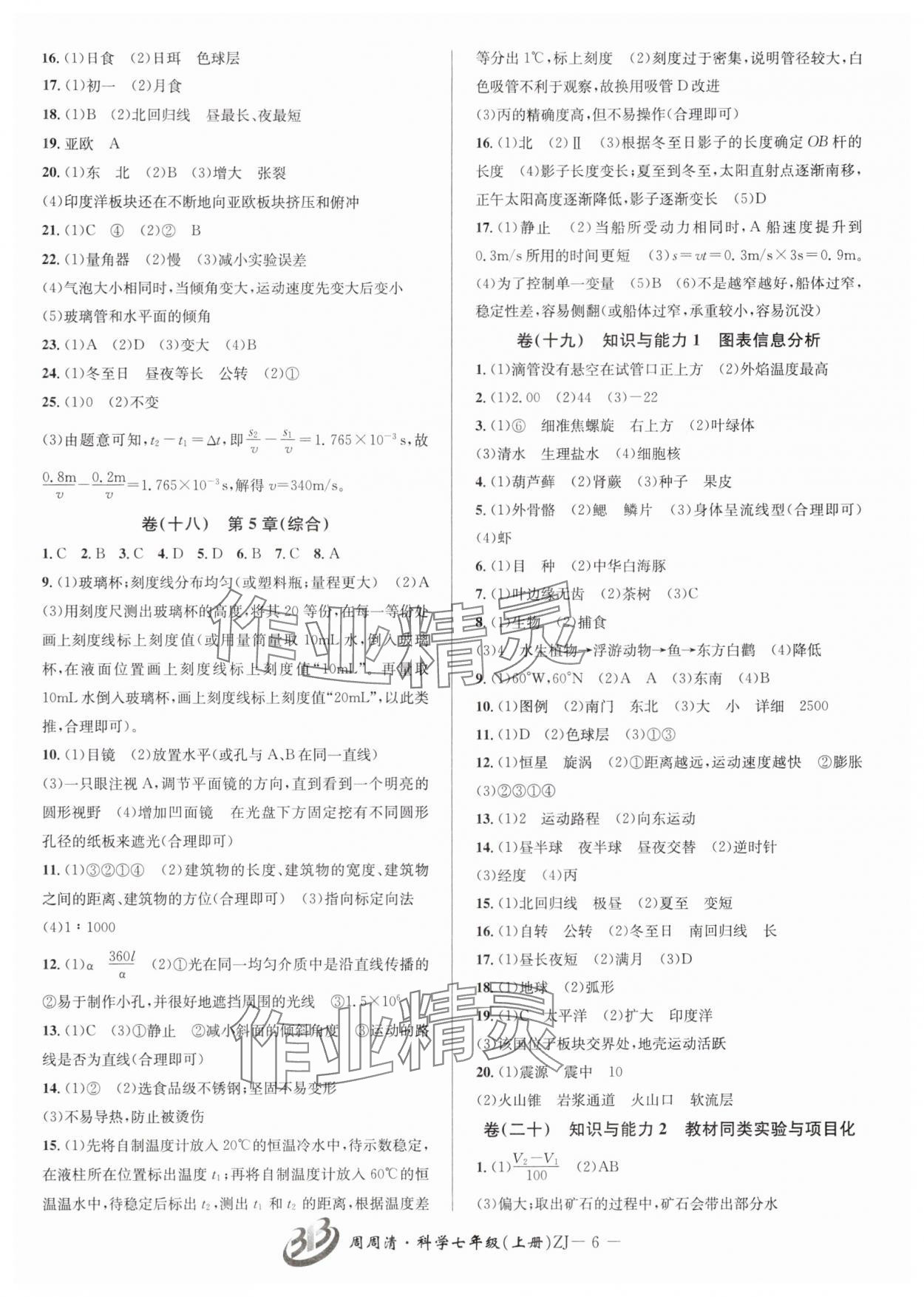 注:目前有些书本章节名称可能整理的还不是很完善,但都是按照顺序排列的,请同学们按照顺序仔细查找。练习册 2024年周周清检测七年级科学上册浙教版 答案主要是用来给同学们做完题方便对答案用的,请勿直接抄袭。