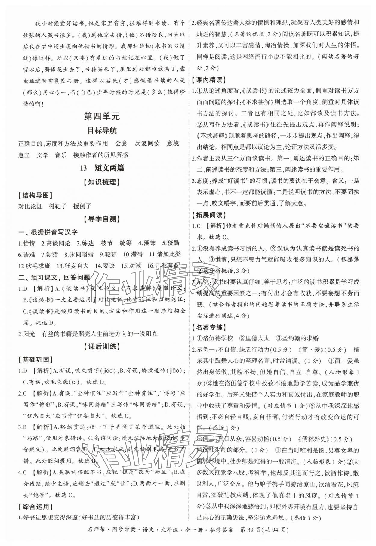 注:目前有些书本章节名称可能整理的还不是很完善,但都是按照顺序排列的,请同学们按照顺序仔细查找。练习册 2024年名师帮同步学案九年级语文全一册人教版 答案主要是用来给同学们做完题方便对答案用的,请勿直接抄袭。