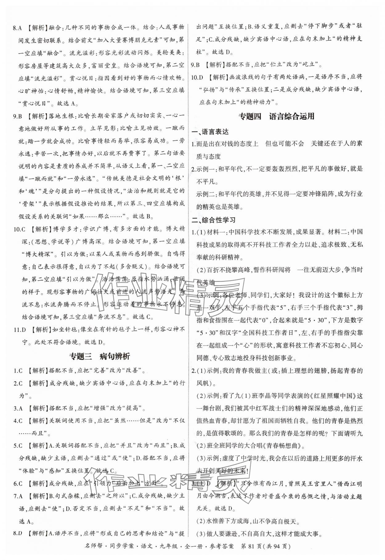 注:目前有些书本章节名称可能整理的还不是很完善,但都是按照顺序排列的,请同学们按照顺序仔细查找。练习册 2024年名师帮同步学案九年级语文全一册人教版 答案主要是用来给同学们做完题方便对答案用的,请勿直接抄袭。