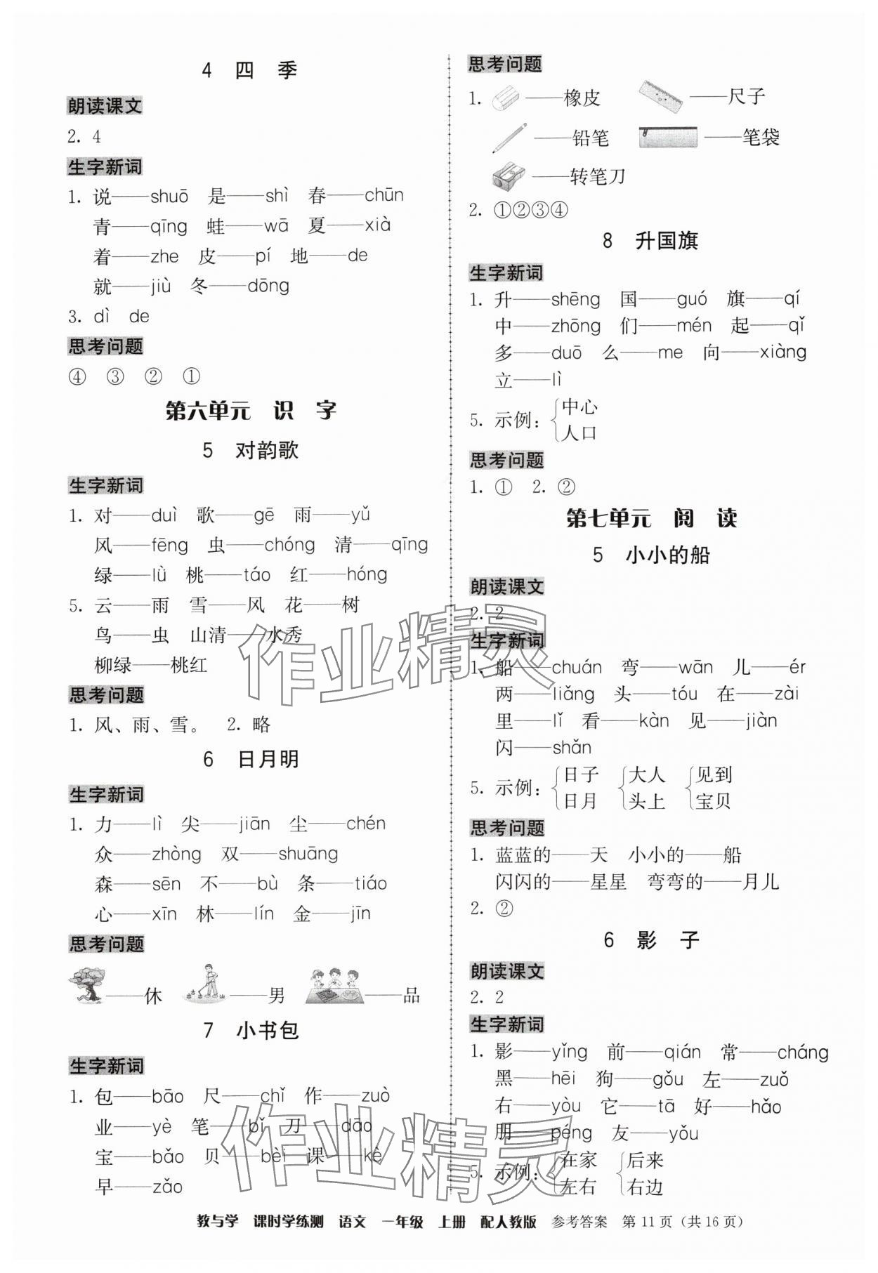 注:目前有些书本章节名称可能整理的还不是很完善,但都是按照顺序排列的,请同学们按照顺序仔细查找。练习册 2024年教与学课时学练测一年级语文上册人教版 答案主要是用来给同学们做完题方便对答案用的,请勿直接抄袭。