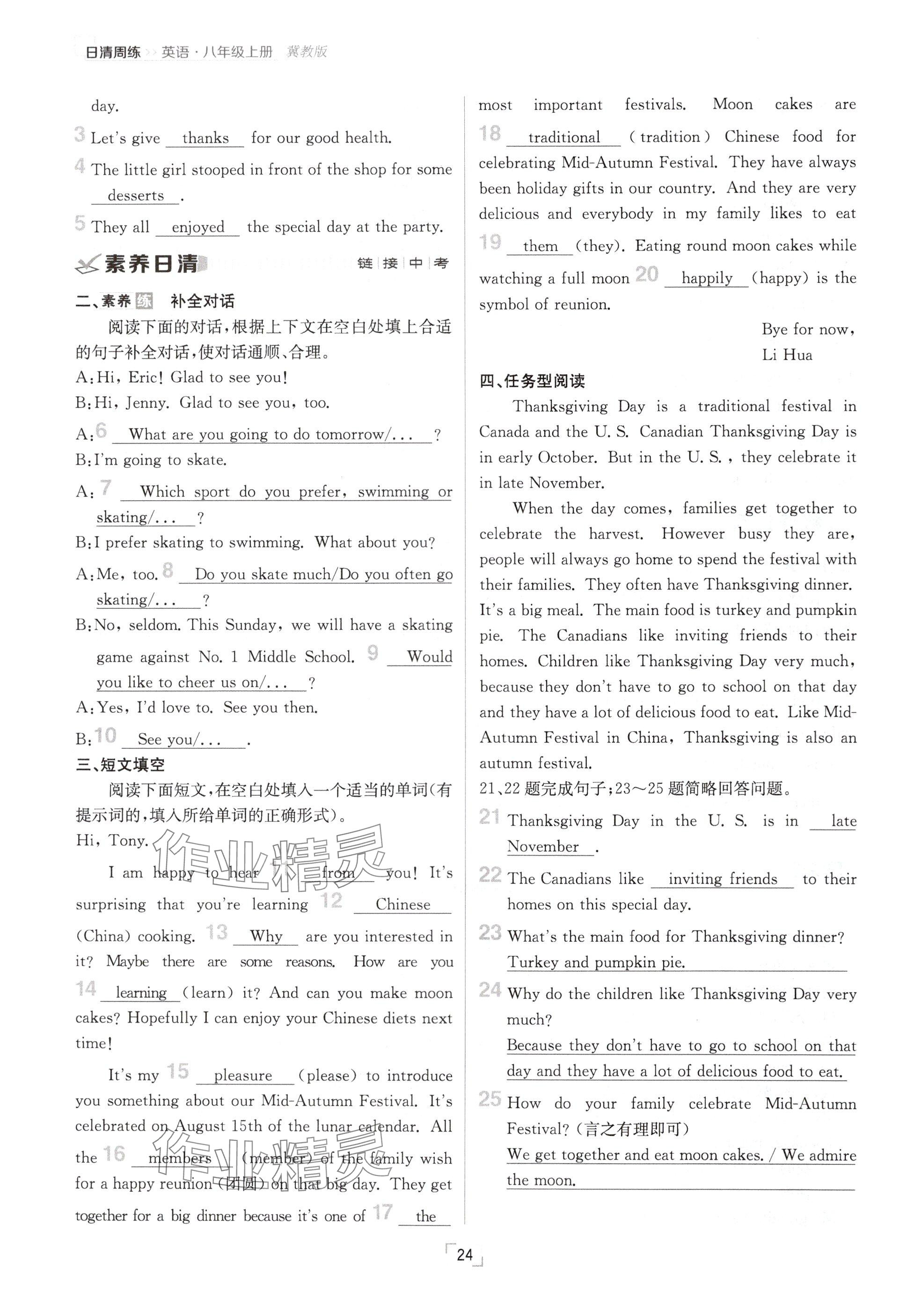 注:目前有些书本章节名称可能整理的还不是很完善,但都是按照顺序排列的,请同学们按照顺序仔细查找。练习册 2024年日清周练八年级英语上册冀教版 答案主要是用来给同学们做完题方便对答案用的,请勿直接抄袭。