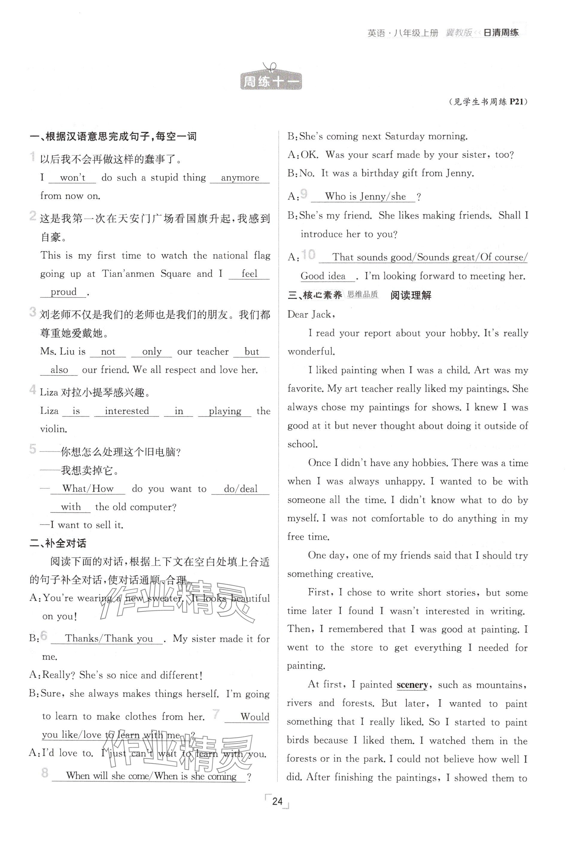 注:目前有些书本章节名称可能整理的还不是很完善,但都是按照顺序排列的,请同学们按照顺序仔细查找。练习册 2024年日清周练八年级英语上册冀教版 答案主要是用来给同学们做完题方便对答案用的,请勿直接抄袭。