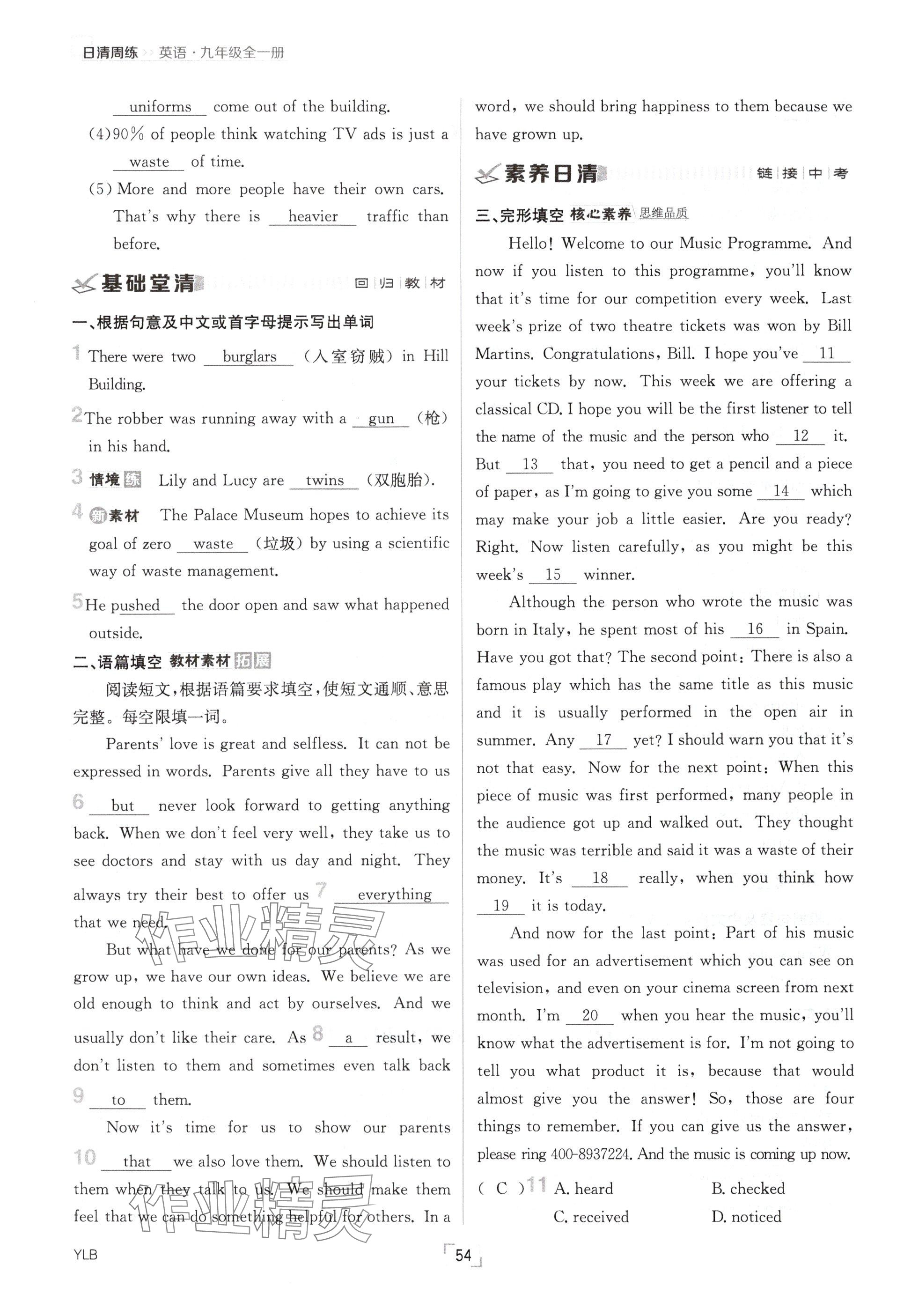 注:目前有些书本章节名称可能整理的还不是很完善,但都是按照顺序排列的,请同学们按照顺序仔细查找。练习册 2024年日清周练九年级英语全一册译林版 答案主要是用来给同学们做完题方便对答案用的,请勿直接抄袭。