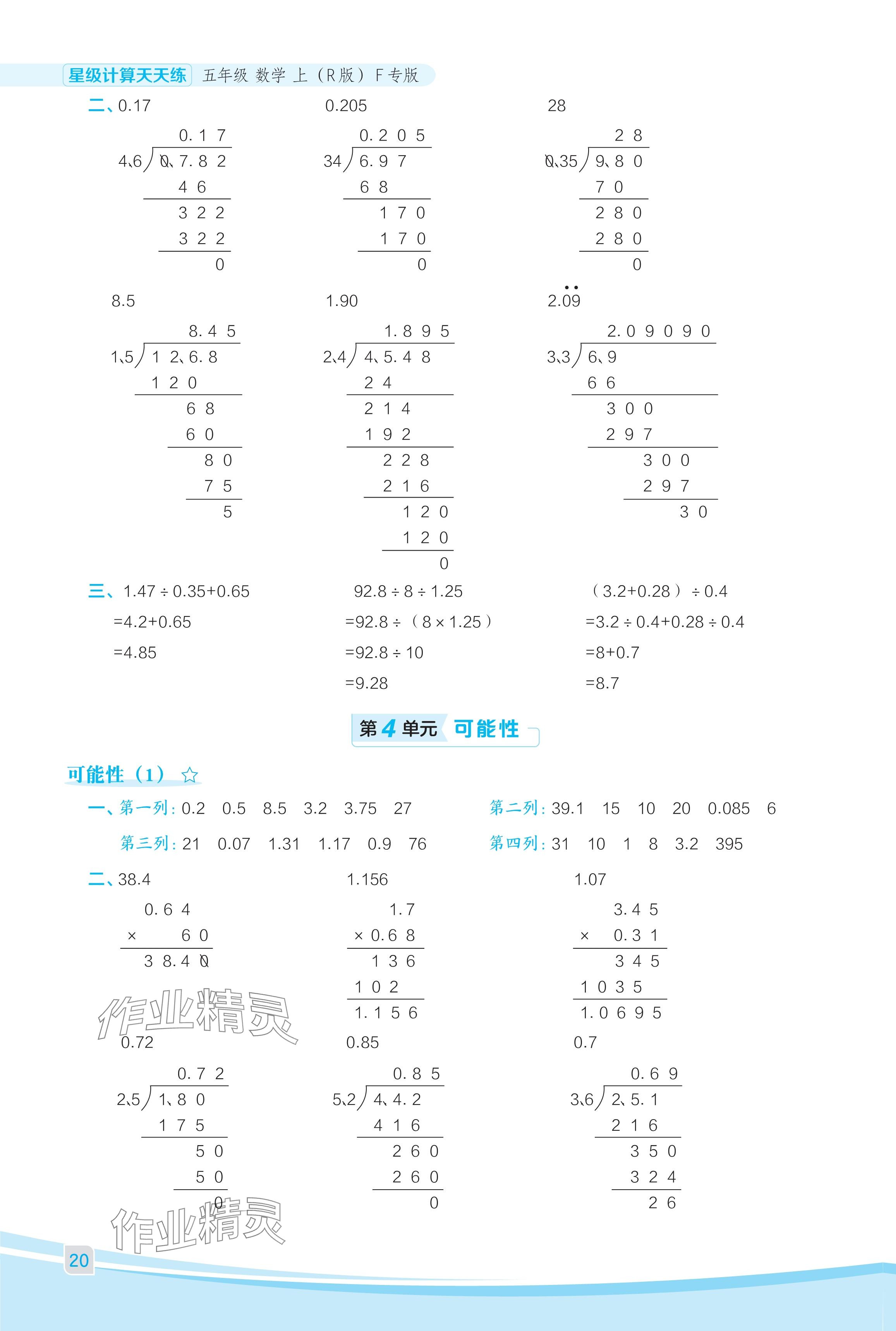 注:目前有些书本章节名称可能整理的还不是很完善,但都是按照顺序排列的,请同学们按照顺序仔细查找。练习册 2024年星级口算天天练五年级数学上册人教版福建专版 答案主要是用来给同学们做完题方便对答案用的,请勿直接抄袭。