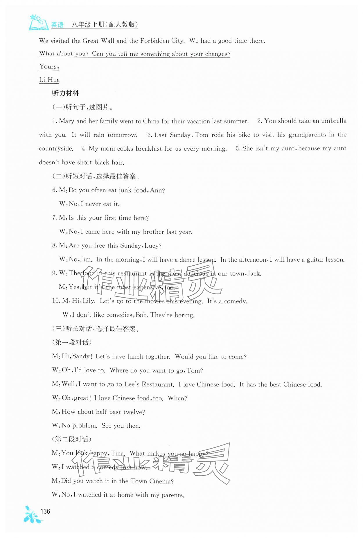 注:目前有些书本章节名称可能整理的还不是很完善,但都是按照顺序排列的,请同学们按照顺序仔细查找。练习册 2024年自主学习能力测评八年级英语上册人教版 答案主要是用来给同学们做完题方便对答案用的,请勿直接抄袭。