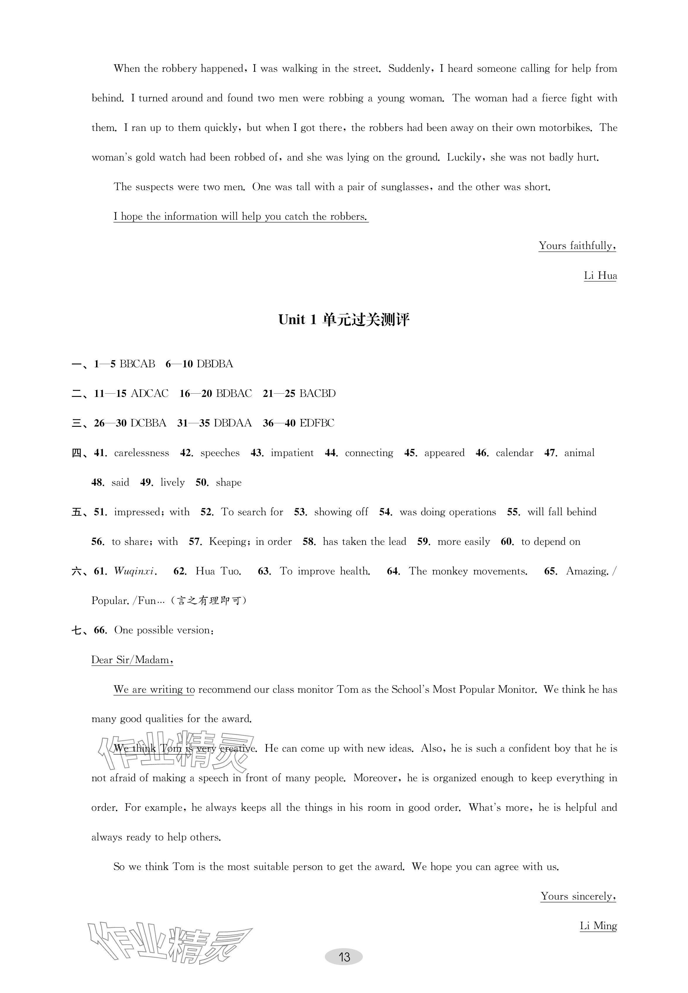 注:目前有些书本章节名称可能整理的还不是很完善,但都是按照顺序排列的,请同学们按照顺序仔细查找。练习册 2024年关键能力进阶九年级英语上册译林版 答案主要是用来给同学们做完题方便对答案用的,请勿直接抄袭。
