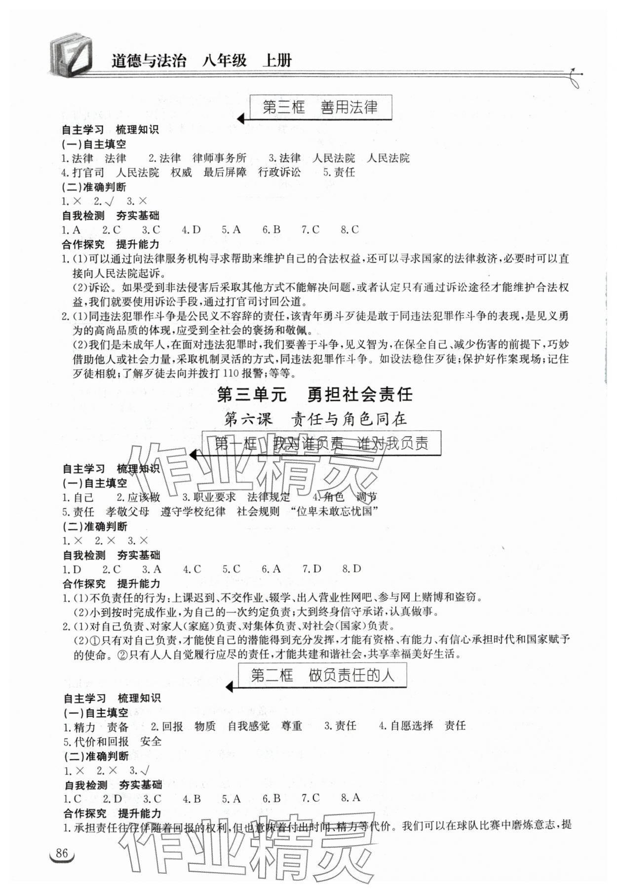 注:目前有些书本章节名称可能整理的还不是很完善,但都是按照顺序排列的,请同学们按照顺序仔细查找。练习册 2024年长江作业本同步练习册八年级道德与法治上册人教版 答案主要是用来给同学们做完题方便对答案用的,请勿直接抄袭。
