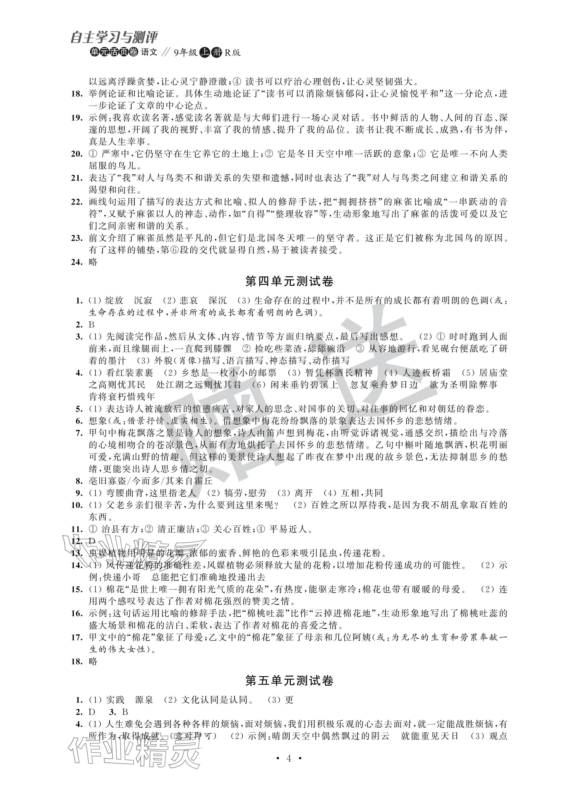注:目前有些书本章节名称可能整理的还不是很完善,但都是按照顺序排列的,请同学们按照顺序仔细查找。练习册 2024年自主学习与测评单元活页卷九年级语文上册人教版 答案主要是用来给同学们做完题方便对答案用的,请勿直接抄袭。